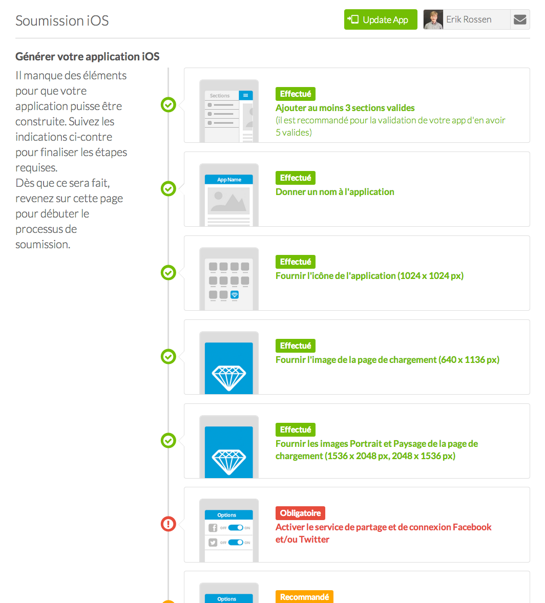 7. GoodBarber vous fournit une liste d'étapes obligatoires et recommandées avant la soumission de votre application. Dans la capture d'écran ci-dessous, vous pouvez voir quelques éléments essentiels pour que votre application soit approuvée.