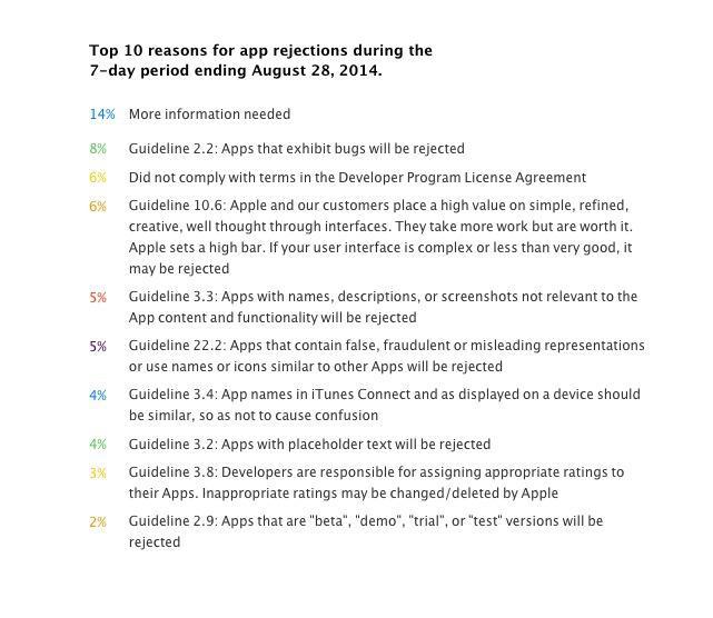 Le volume des applications développées oblige l'équipe de révision à Cupertino à garder les yeux rivés à leurs ordinateurs portables. C'est peut-être la raison pour laquelle on peut trouver cet article sur le site d'Apple : Common App Rejections , les causes les plus fréquentes de rejet, soit une liste des raisons principales de refus. Pour la dernière semaine du mois d'août 2014, pas moins de 14% des rejets sont imputables au manque d'information, et dans 8% des cas c'est à cause de bugs.
