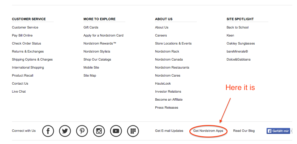 Il ne suffit pas de publier son application en suivant le processus dans les stores en espérant qu'on obtiendra des masses de téléchargements de clients existants, il faut les informer de l'existence de l'application. Par exemple, Nordstrom a bel et bien une application, mais on ne peut pas le savoir sauf à faire défiler l'écran jusqu'au bas de leur site web.