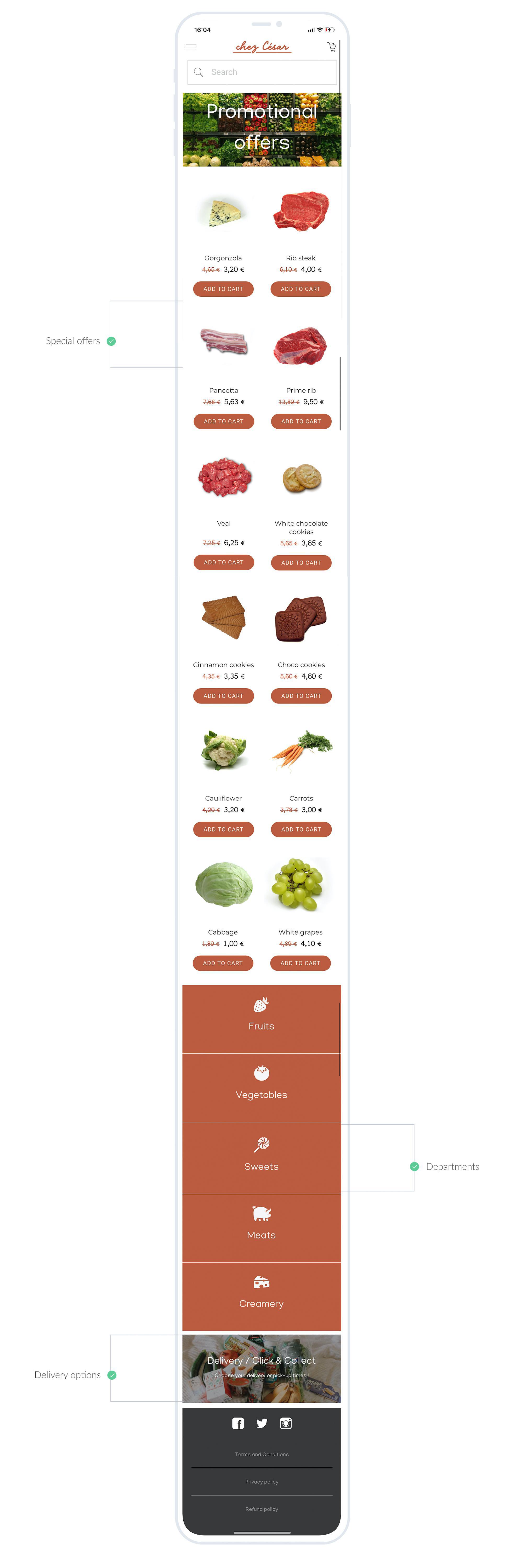 L'application a été pensée pour présenter en priorité les promotions proposées par l'épicerie, comme une tête de gondole dans un magasin physique. On affiche ensuite les différentes rayons de l'épicerie qui permettent, associés au moteur de recherche et au mode de navigation, de retrouver facilement les produits. Enfin, les options de livraison sont clairement présentées sur la Home page de l'application.