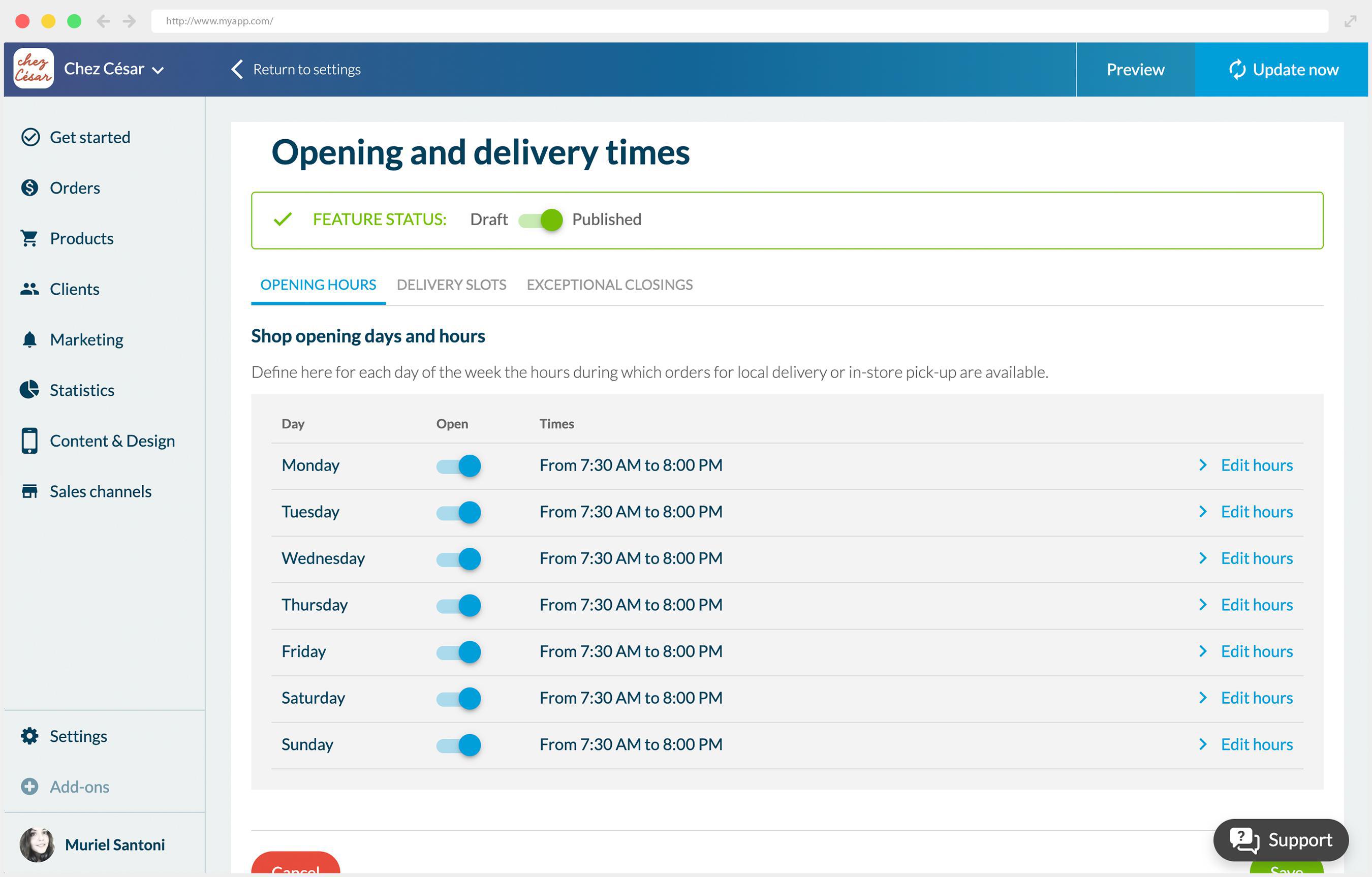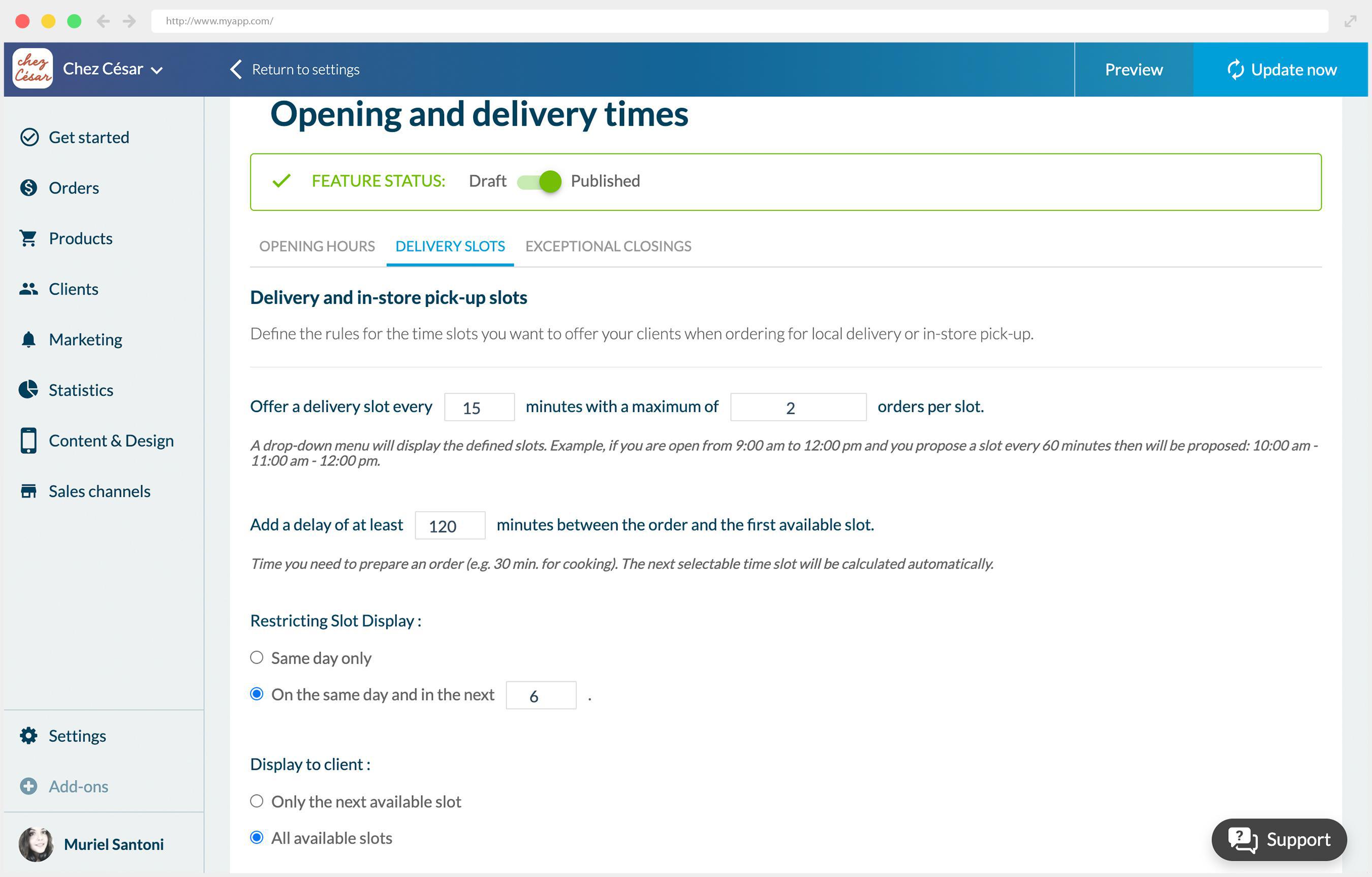 Pour mieux s'organiser et offrir encore plus de confort à ses clients, le gérant de Chez César a décidé d'activer la fonctionnalité Créneaux de Livraison. Elle lui permet de définir des créneaux durant lesquels les clients pourront choisir l'heure à laquelle ils souhaitent être livrés ou venir récupérer leurs courses.