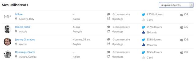 Dans la liste utilisateurs proposées dans votre back office Users > Mes utilisateurs > Liste, vous pouvez visualiser non seulement les connexions et / inscriptions les plus récentes, mais aussi découvrir le comportement de vos utilisateurs à l'intérieur de l'application. Est-ce qu'ils partagent votre contenu par exemple ? Plus encore, vous pouvez savoir combien de followers ils ont sur Twitter et Facebook. Des données précieuses pour identifier de potentiels influenceurs intéressées par votre projet et les convertir en ambassadeurs.