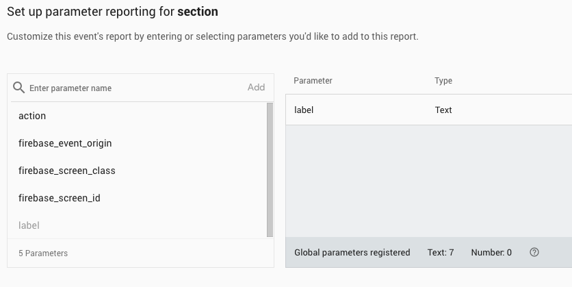 Chaque évènement possède des attributs, appelés aussi paramètres. Le SDK Firebase collecte tous les évènements et leurs paramètres, mais la console n'affiche pas tout dans les rapports. Vous devez faire un choix. Pour cela, rendez-vous dans le menu Analytics > Events de la console. Choisissez dans la liste l'évènement qui vous intéresse et ouvrez les options de reporting.