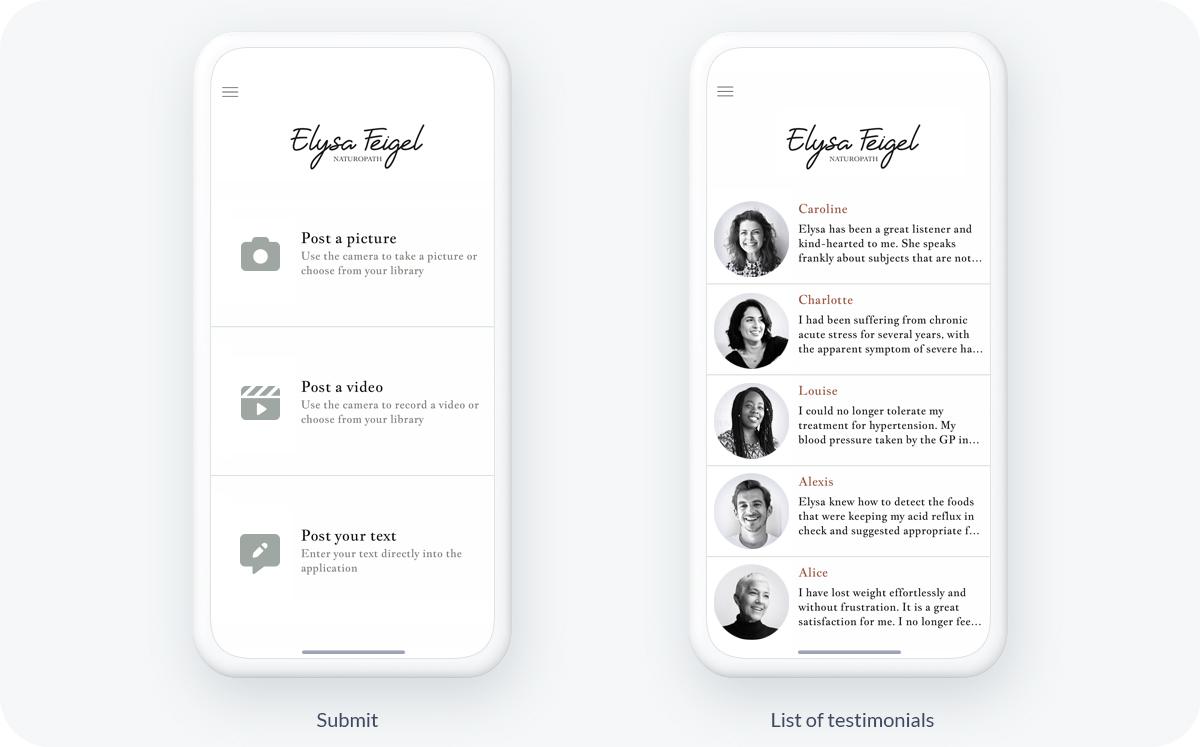 C'est exactement ce que nous avons fait dans l'app Elysa Feigel. Les clients envoient leur avis accompagnés d'une photo via la section Soumission. Ces avis récoltés sont ensuite republiés proprement dans une section Articles.