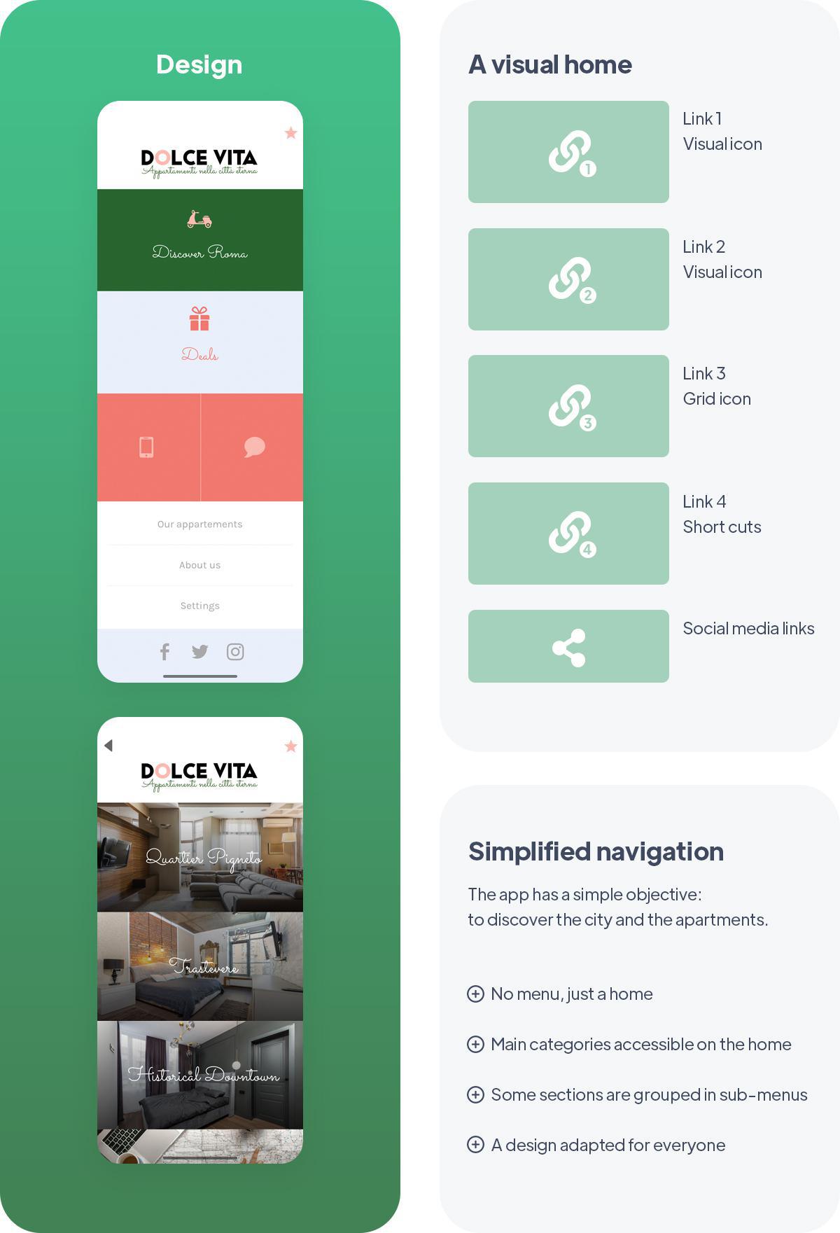 L’objectif de cette app est simple : faire découvrir la ville de Rome et mettre en avant les appartements proposés par l’hôte aux voyageurs. Elle doit donc être claire et facile à utiliser. Le contenu doit aller à l’essentiel, l’objectif étant d’éliminer les éléments superflus qui risquent de freiner la navigation des utilisateurs. L’expérience utilisateur doit être optimale, d’où l’importance d’une navigation simplifiée et intuitive.