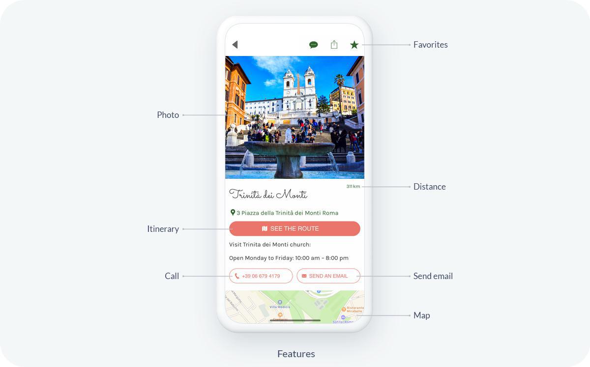 Votre app vous permet de présenter les lieux à visiter directement sur une carte, afin que les voyageurs puissent s’y rendre sans encombre, et accéder à un itinéraire depuis le call to action « voir le trajet ». Plusieurs présentations des lieux sont disponibles :