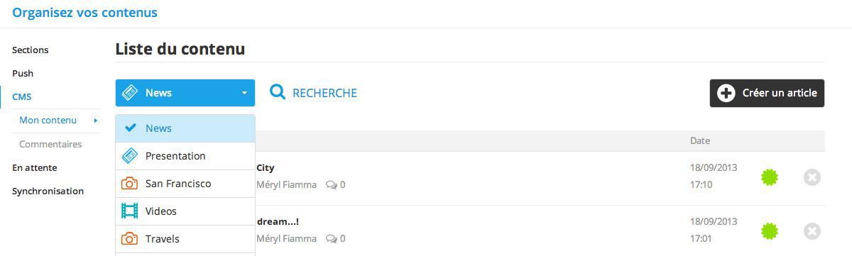 Avec le CMS intégré, vous pouvez créer des articles, poster des vidéos et ajouter des photos dans votre application, faire une modification (texte, video, fichier, taille image, etc) directement depuis l'interface de gestion de votre application.