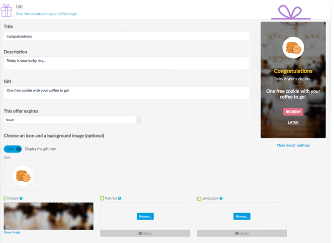 Encore de quoi faire appel à votre potentiel créatif ! Non seulement vous pouvez personnaliser le cadeau, son image / icône, le texte qui l’accompagne, sa date d’expiration, mais aussi l’image de fond. Attention simplement à respecter les tailles précisées dans le back office, et cela pour chaque vue, portrait et landscape. N'oubliez pas que chaque détail compte pour la mise en forme ;)