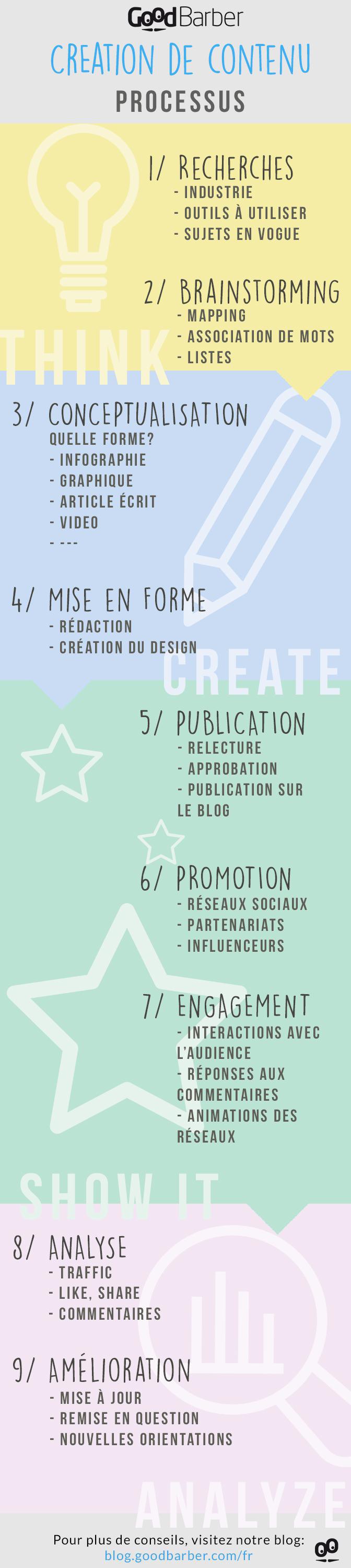 Ce n'est plus un secret pour personne, la création de contenu est aujourd'hui un outil marketing considérable, et ses preuves ne sont plus à faire. Si elle apporte de nombreux bénéfices aux entreprises qui la pratiquent, elle demande tout de même une certaine rigueur, et surtout, du temps. Les petites structures ne peuvent souvent pas se permettre de créer une équipe dédiée, et se retrouvent, de fait, un peu perdues face à l'ampleur de la tâche. Voilà pourquoi j'ai décidé de vous proposer aujourd'hui un guide rappelant brièvement les étapes principales du processus de création de contenu. L'infographie qui l'accompagne, synthétise l'information tout en vous faisant un pense-bête pratique, vers lequel revenir.