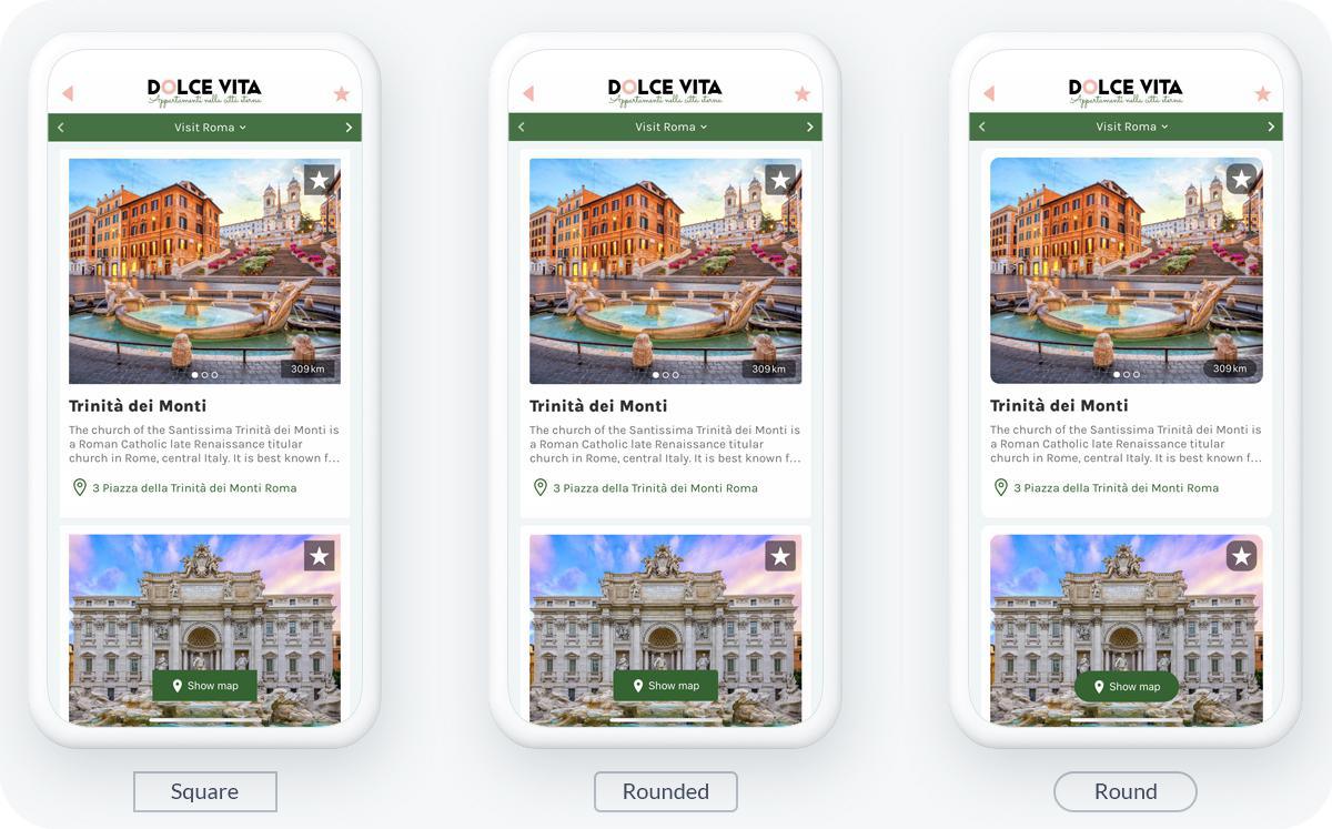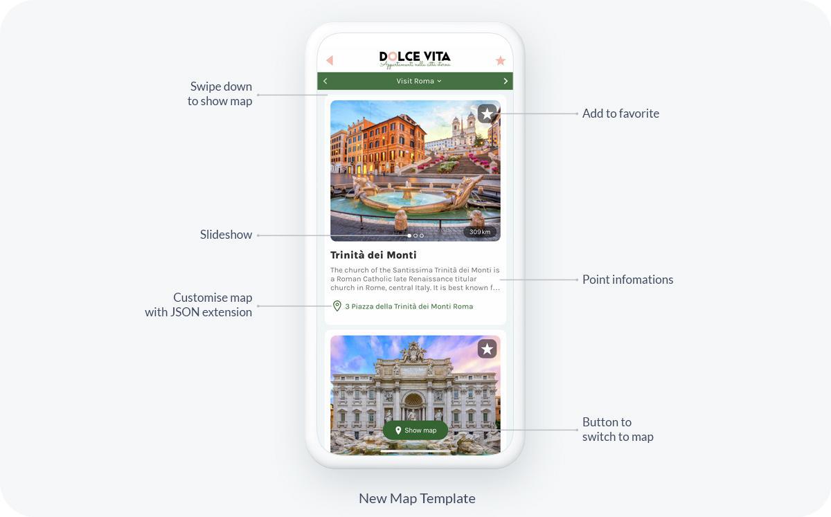 Cela s'applique parfaitement à votre section de carte. Elle vous permet de présenter le slideshow de toutes les illustrations de vos lieux de la meilleure façon possible. Grâce à la forme arrondie, vous donnerez à votre application un aspect plus moderne.