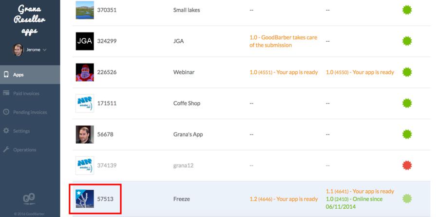 La première chose que vous remarquerez sûrement dans votre dashboard revendeur, toutes vos applications y sont listées, avec leur statut de publication sur chaque plate-forme, iOS et Android. Vous pouvez aussi créer de nouvelles applications natives ou PWAs depuis cette interface, ajouter des applications existantes pour les rapatrier sous votre compte Reseller ou, à l'inverse, supprimer des applications de votre compte. Vous pouvez aussi assurer le transfert de propriété d'une app, ou encore, désactiver temporairement un projet, une option utile si vous rencontrez des problèmes lors de la facturation avec un client par exemple.