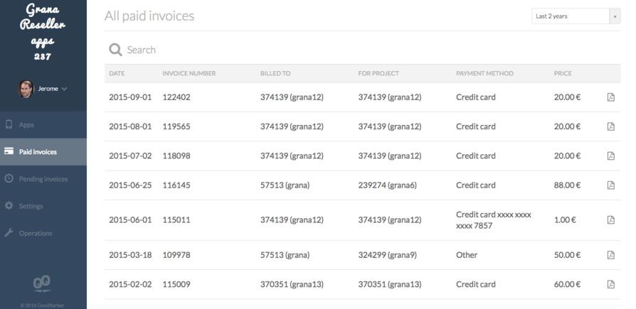 En parlant de facturation justement, toutes les factures réglées et en attente sont présentes dans l'interface. Le numéro d'identification assigné à chaque achat vous permet de suivre avec précision de quel projet il s'agit, pratique pour rattacher l'activation d'un Add-On à un projet donné par exemple, dans la mesure où tous les paiements s'effectuent depuis un seul et même back office, votre projet alpha.