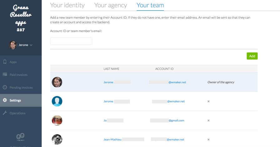 Si vous voulez partager l'accès au dashboard reseller avec votre équipe, vous pouvez inviter autant de collaborateurs que vous le souhaitez. Sachez simplement que le dashboard revendeur n'est pas en marque blanche, dans cette interface, la marque GoodBarber n'est plus cachée.