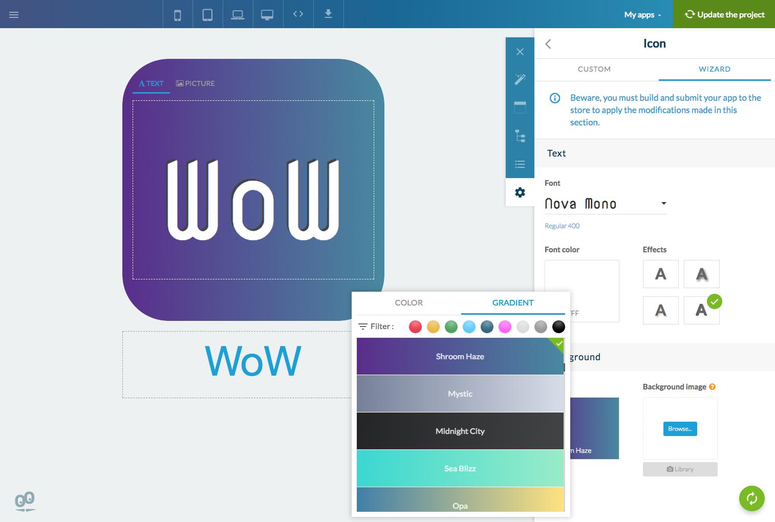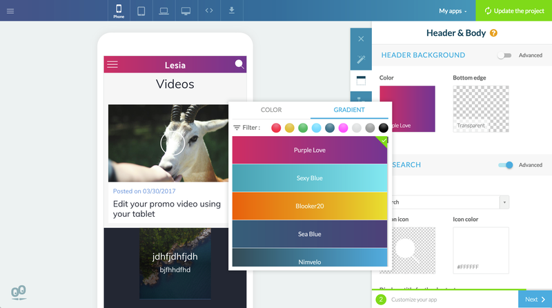 C'est la raison pour laquelle nous avons développé un système permettant de choisir son dégradé dans une bibliothèque très complète (cette librairie est connectée au service https://uigradients.com). Une fois les motifs choisis, il sont générés automatiquement et appliqué au design de votre app.
