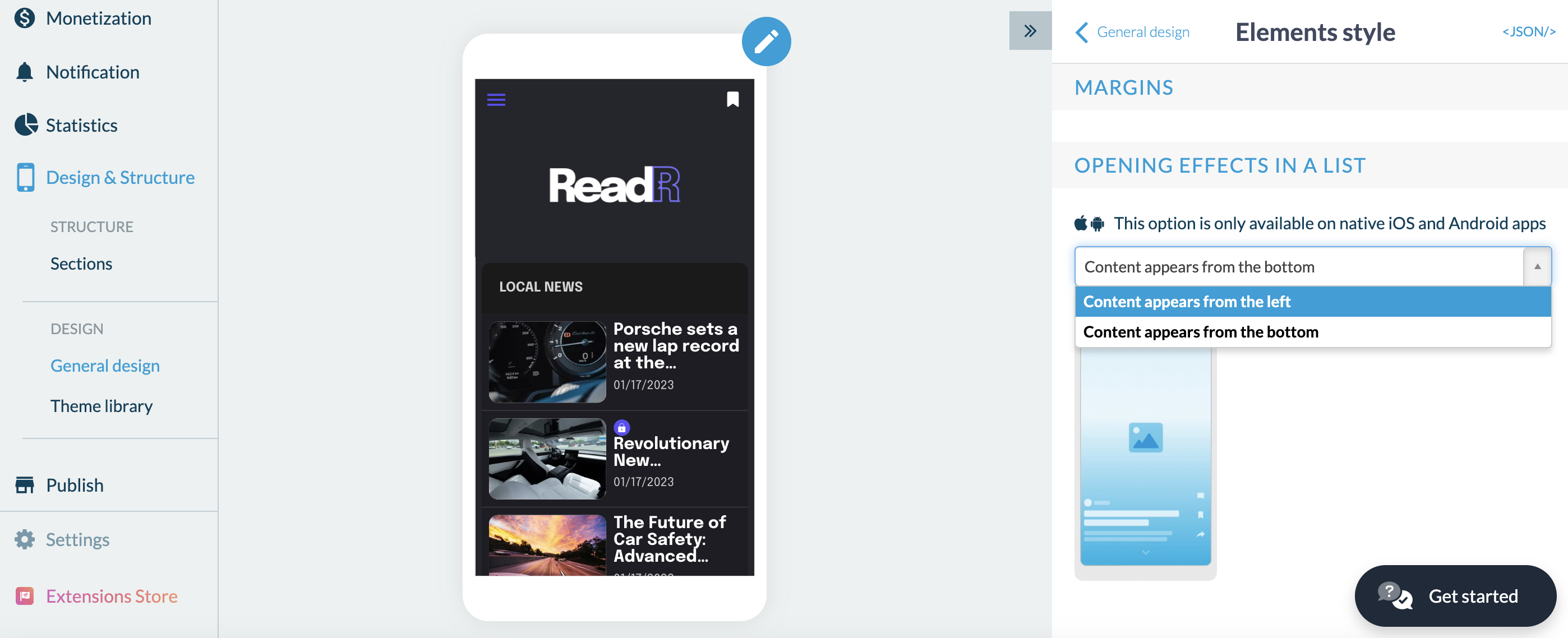 Dans le menu Design général > Style des éléments > situé en bas du panneau d'édition, vous pouvez choisir dans une liste les effets d'ouverture que vous souhaitez appliquer :