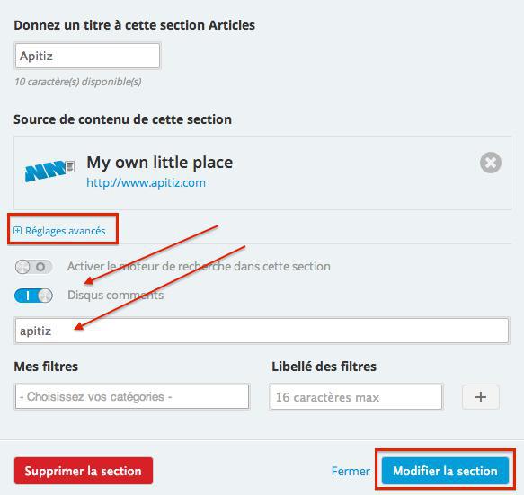 Affichez les paramètres avancés de la section et activez les commentaires Disqus. Collez ensuite votre shortname.