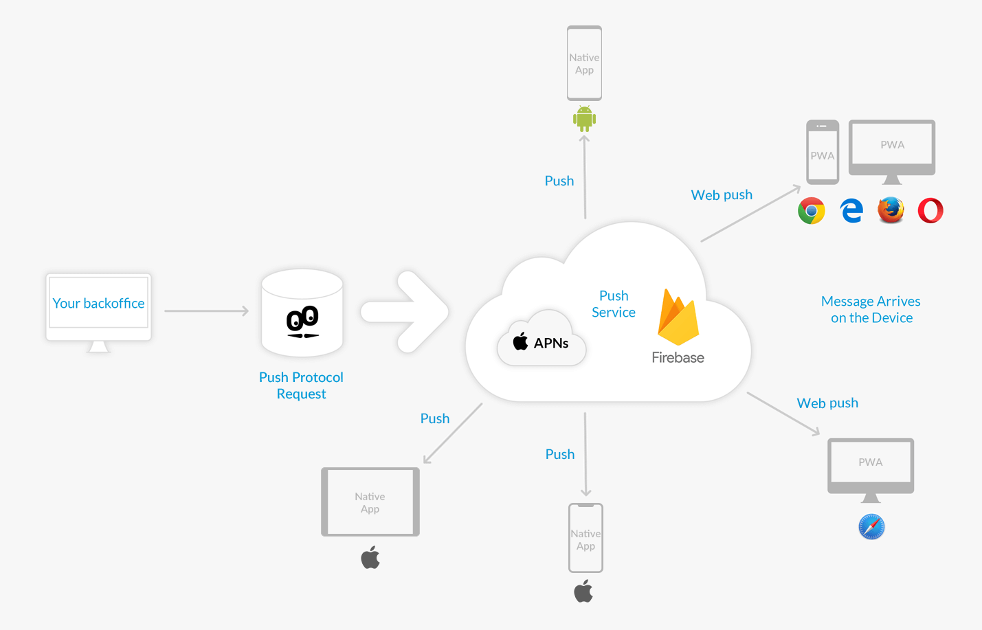- Apple Push Notification System (APNs) : pour les applications natives iOS et pour les PWA consultées depuis Safari macOS.