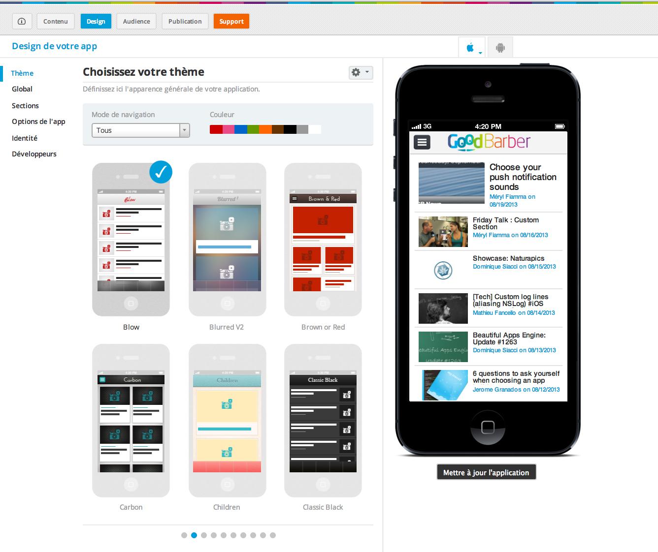 Lorsque je crée une application, je commence toujours par choisir le bon thème. Il faut tenter de choisir un thème qui se rapproche le plus du style et des couleurs de votre logo.