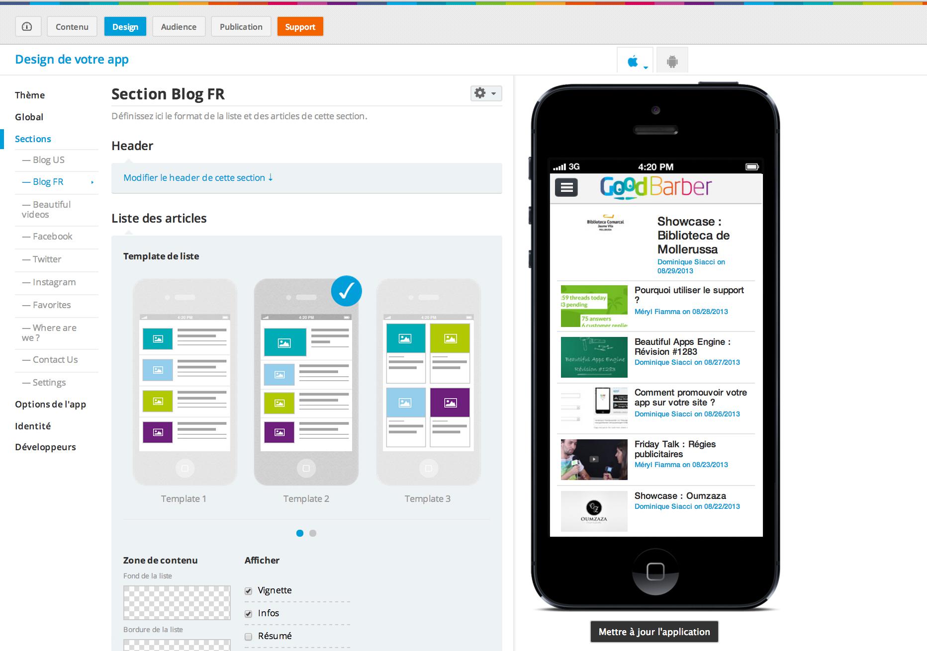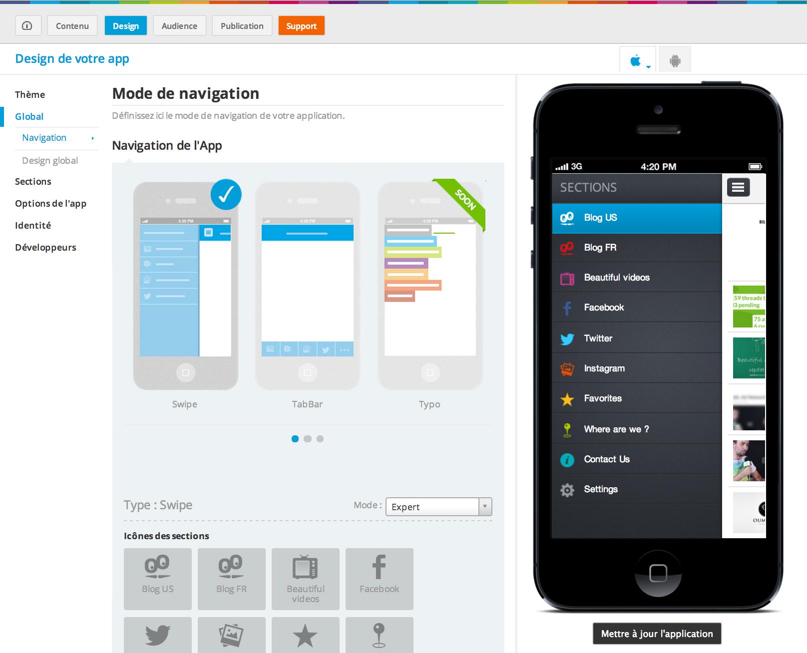 Comme par exemple, s'il y a plus de 5 sections, il est préférable de choisir le mode swipe que le mode tabBar.
