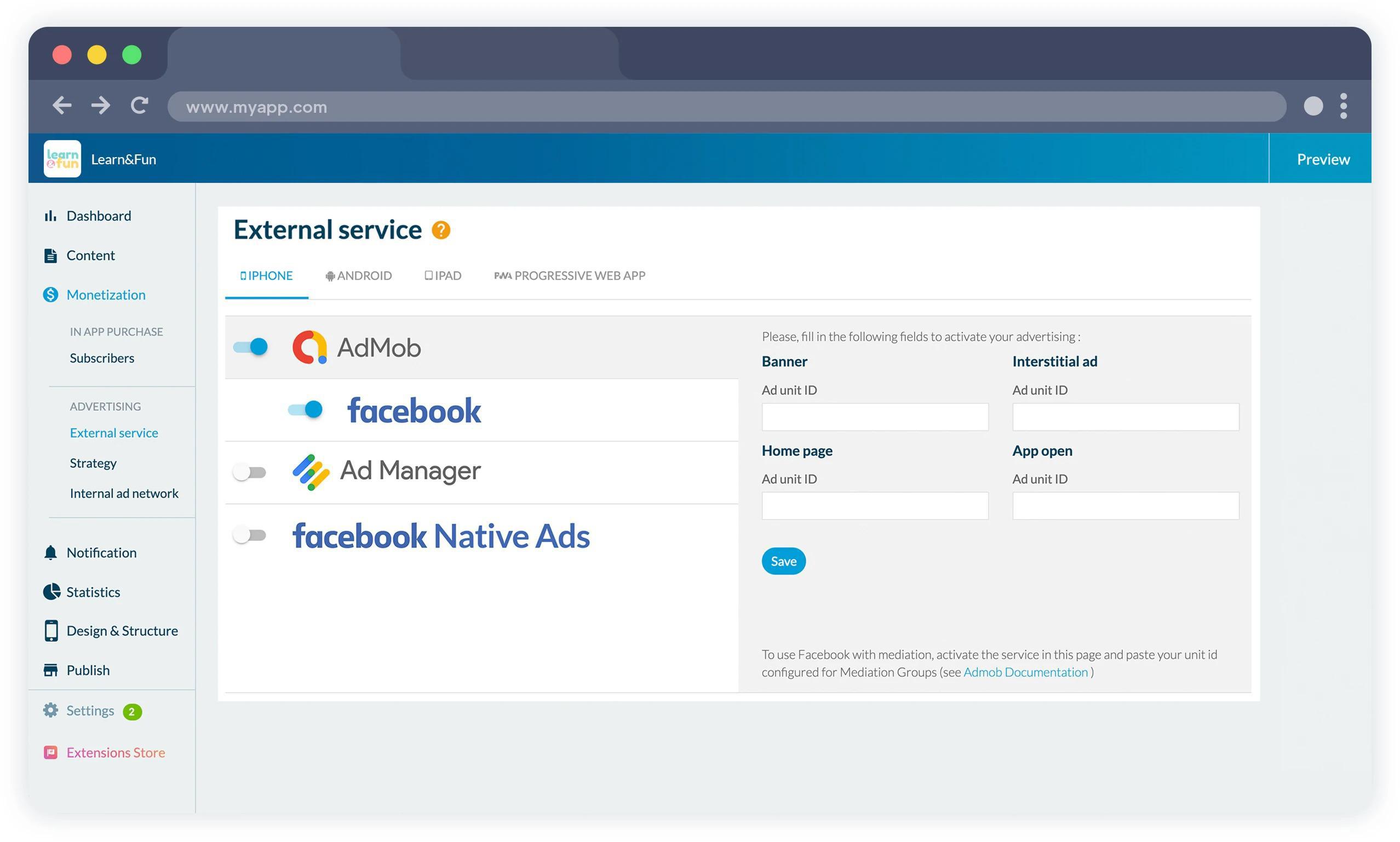 Dans votre backoffice, sous le menu Monétisation > Service externe, vous pouvez voir un nouvel onglet "Facebook" sous Admob. C'est ici que vous activez le service.
