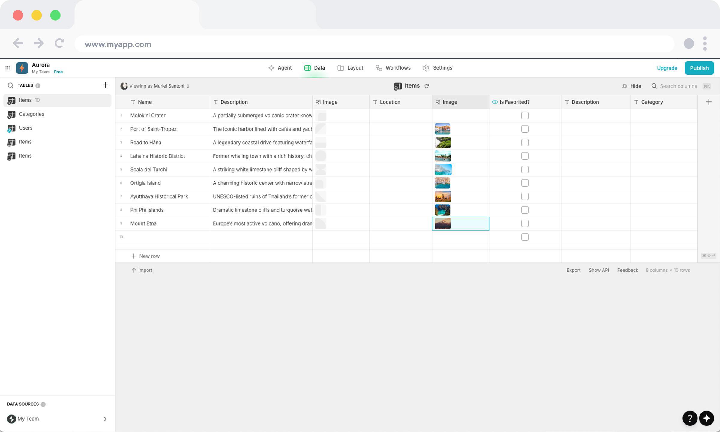 Glide est probablement l’un des outils les plus rapides du marché lorsqu’une partie de la structure du projet existe déjà dans un tableau ou une base. Dans le cadre d’AURORA, on peut très vite donner forme à une première version du produit en branchant les destinations, les lieux, les événements et les contenus dans une structure exploitable.