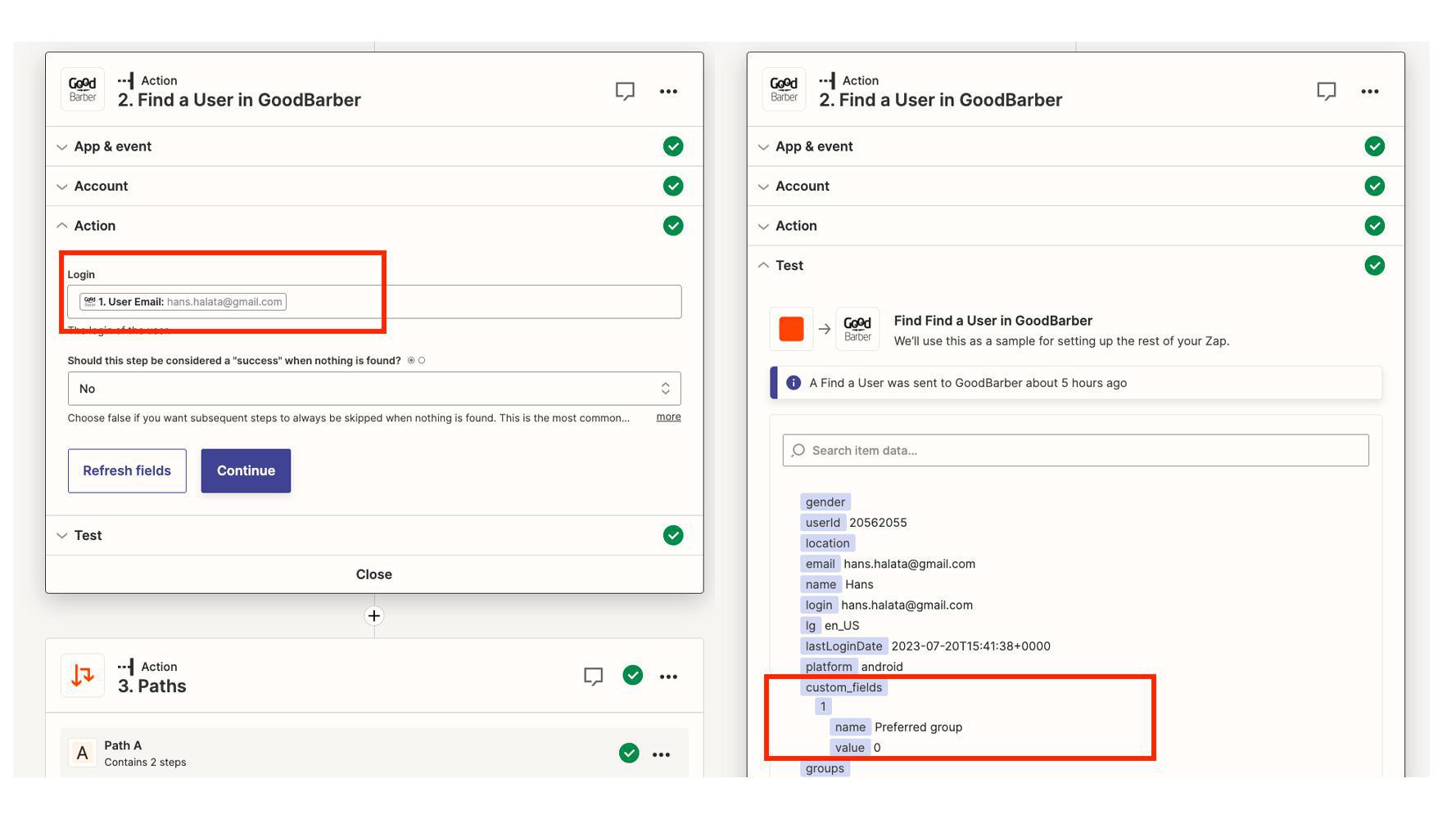 Ensuite, j'ajoute une action de recherche "Find a User in GoodBarber". Elle me permet de connaitre le groupe choisi par l'utilisateur lors de l'inscription. Le critère de recherche attendu par cette action est l'email de l'utilisateur. L'email de l'utilisateur m'est donné dans l'étape précédente. Il me suffit de l'utiliser dans cette étape.