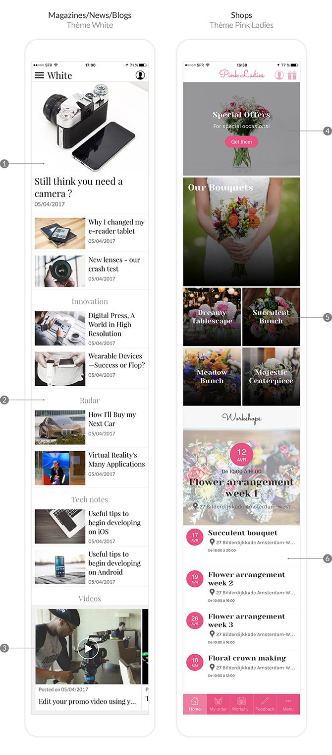 Avec GoodBarber 4.0, chaque home est unique. Cette nouvelle fonctionnalité reste fidèle à l'orientation prise dès la naissance de GB : chaque app doit posséder un design qui lui est propre et incomparable. C'est la raison pour laquelle nous avons procédé au développement de 66 widgets, disponibles dès la sortie de GoodBarber 4.0, pour construire sa home.