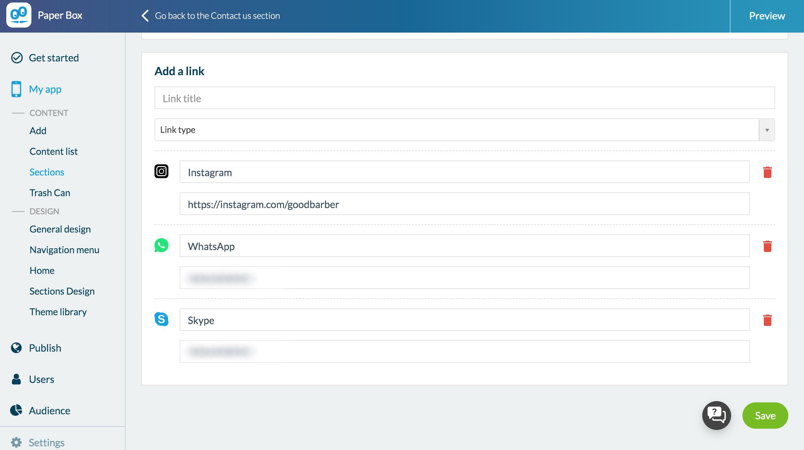 Pour les paramétrer, rendez vous dans le menu Contenu > Sections > Contact > Modifier le contenu. Choisissez le type de lien que vous souhaitez ajouter dans le menu déroulant et entrez les informations demandées.