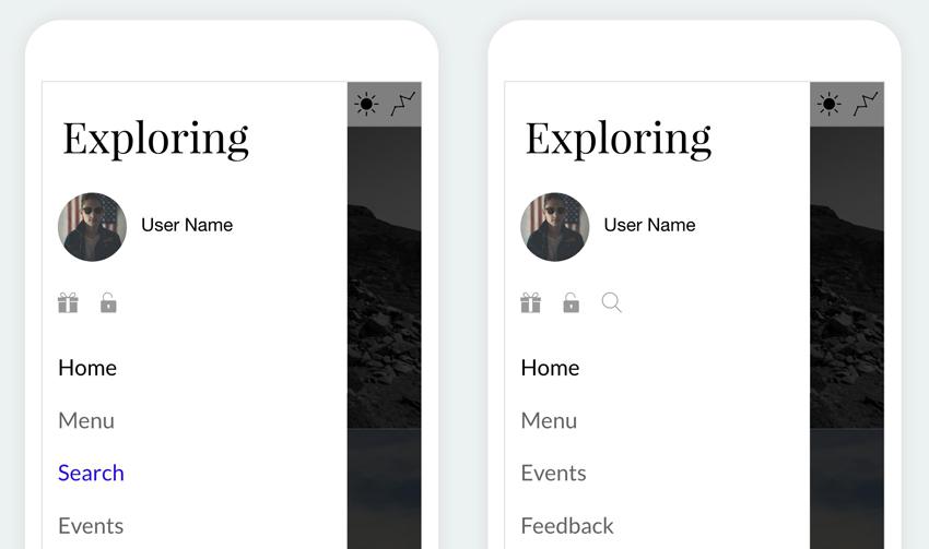 Prenons le cas d'un menu "Swipe". Je peux créer une entrée vers la recherche dans la navigation principale. J'ai même la possibilité de mettre en avant cette entrée en appliquant une couleur différente sur la police, en ajoutant une couleur de fond ou bien en affichant une icone.