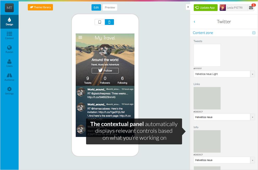 - A droite, les commandes relatives au design de l'application elle-même (couleurs, forme...).