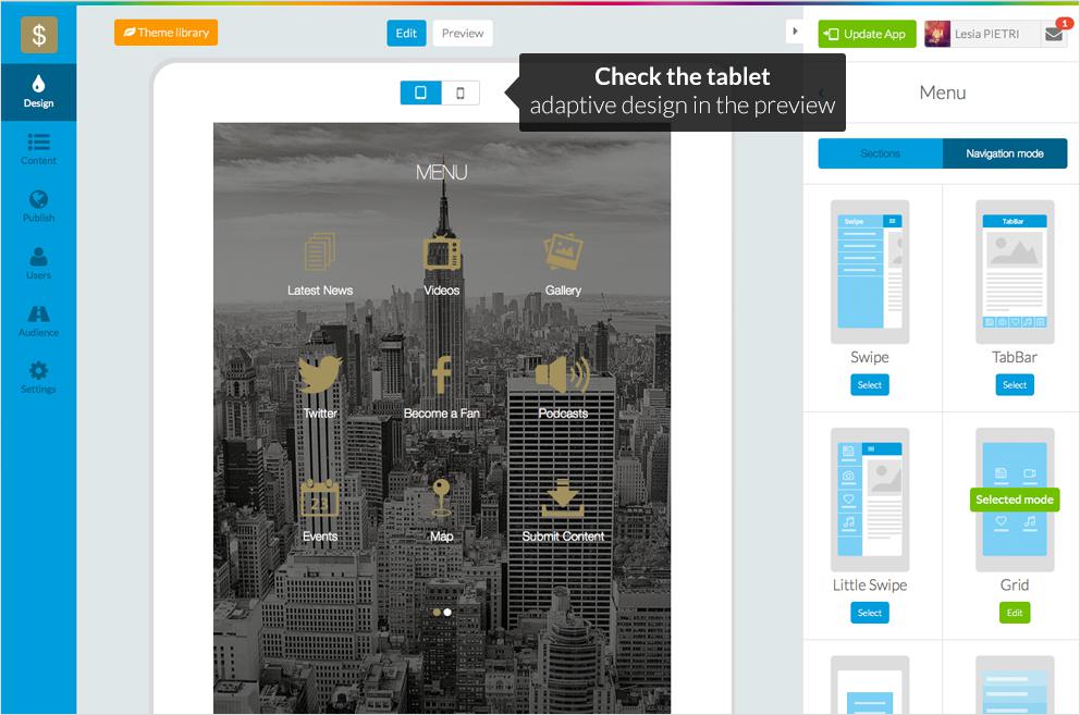 Notre solution était de créer deux versions différentes de chaque thème, chaque mode de navigation, etc. Ainsi, la grande majorité des adaptations sont faites directement par GoodBarber - l'utilisateur fait un seul choix, et les deux versions sont crées automatiquement. Quand un choix spécifique pour chacun des deux appareils est incontournable, l'utilisateur est alerté avec des icônes correspondantes.
