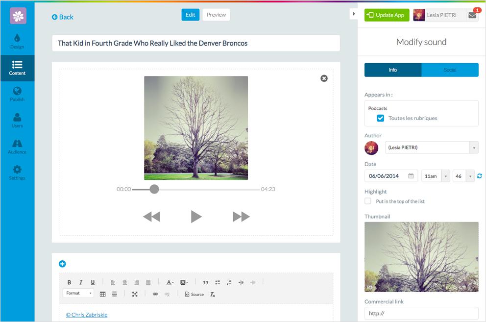 Cela reflète l'importance croissante de l'internet mobile, car beaucoup d'utilisateurs se passent entièrement de certaines formes traditionnelles de présence en ligne, comme un blog par exemple, et se servent d'une appli comme leur première présence sur le web. C'est pourquoi nous n'avons pas seulement amélioré l'interface du CMS, mais nous avons aussi introduit la possibilité d'ajouter des sons, en complément des articles, des images et des vidéos.