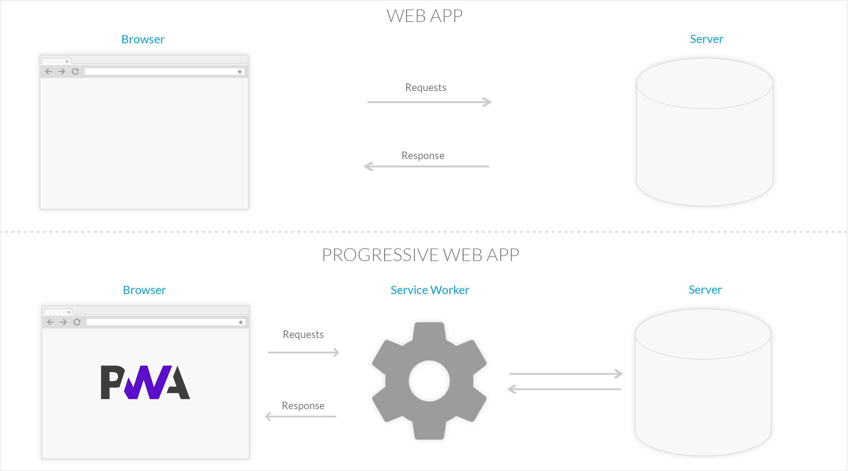 D’un point de vue technique, un service worker est un script exécuté en arrière-plan par un navigateur. Il est capable d’exécuter des actions en réponse à des évènements comme des requêtes réseau, ou des infos transmises par le système d’exploitation (modifications de connectivité par exemple). Il permet aux développeurs de construire des fonctionnalités avancées comme la gestion de notifications push et la gestion du cache. Une fois le service worker installé dans le navigateur, il effectue les tâches qui lui sont assignées de manière indépendante, et ce même si l'utilisateur ne navigue pas sur le site. Le fonctionnement d’un service worker s’approche de celui d’un serveur proxy, il va servir d’intermédiaire entre le navigateur et Internet afin d’améliorer l’expérience utilisateur, notamment en stockant les données d’une page web en cache.
