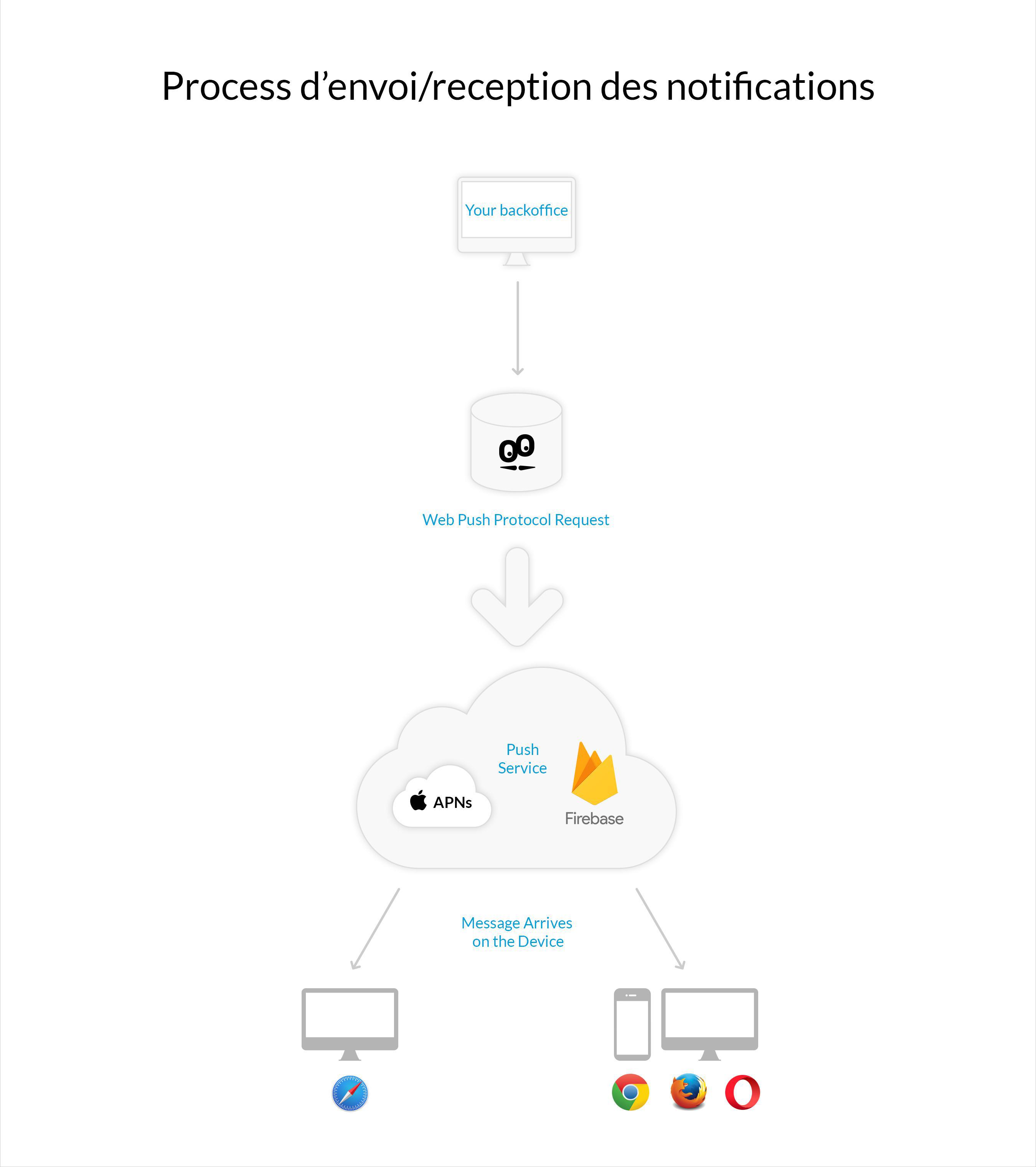 Si les notifications push ne sont pas encore supportées par Safari mobile, elles fonctionnent déjà sur Safari desktop, non pas grâce aux service workers, mais grâce au service de notifications push d’Apple (APNs) qui est un service créé par Apple, permettant à un prestataire de services externe d’envoyer des messages ou des commandes à n’importe quel device Apple fonctionnant sous OS X. Il est important de noter que les notifications pour les sites web n’apparaissent pas sur les devices fonctionnant sous iOS (mobile).