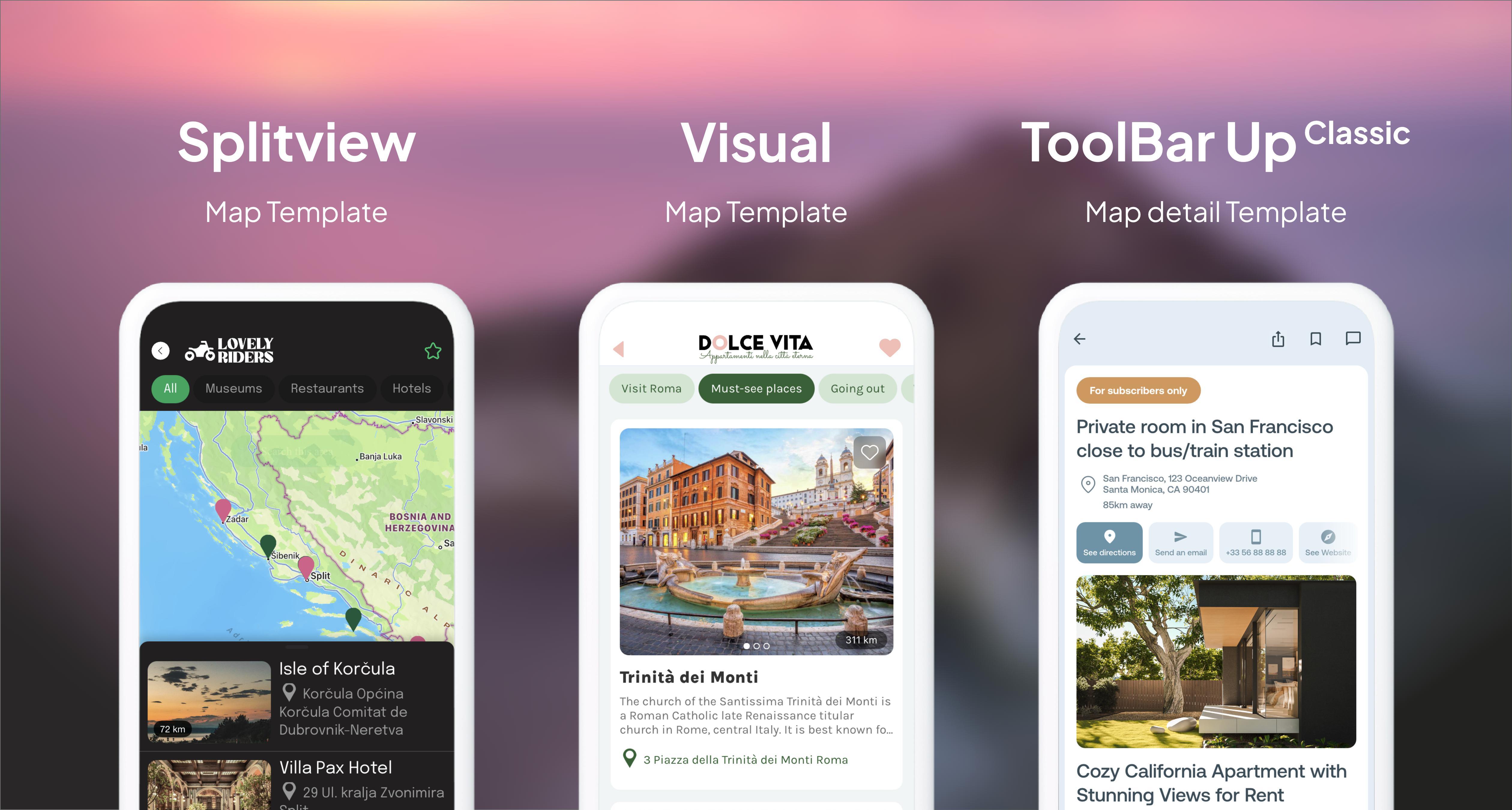 Pour l’affichage des cartes, le nouveau template splitview permet à votre utilisateur de passer d’une vue liste à une vue carte de façon plus intuitive. Un tout nouveau template de widget pour votre section Lieux a fait son entrée : le template Visual , particulièrement adapté, ce nouveau template permet d'afficher plusieurs images pour un lieu grâce à un slideshow intégré. Dans la vue de détail, la template ToolBar Up Classic les boutons d’actions sont en haut de page et, via une animation subtile, descendent vers le bas au fur et à mesure que l’on fait défiler le contenu.