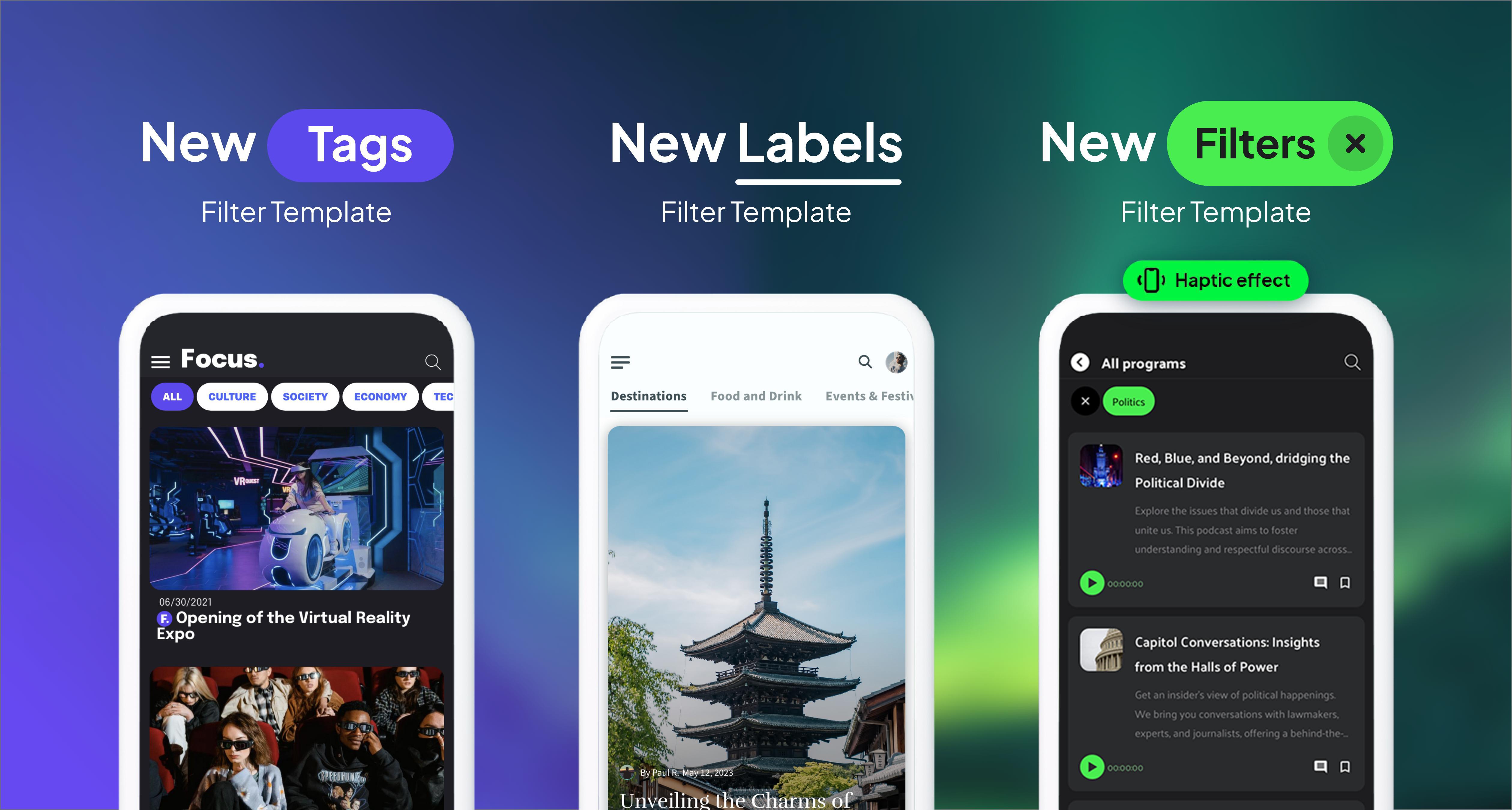 Pour l’affichage de contenu dans des listes, nous avons ajouté de nouvelles templates pour les articles , les évènements , les cartes et les podcasts . Outre l'aspect plus moderne du design, nous avons ajouté la possibilité d’effectuer des actions directement sur les items, sans quitter la liste.
