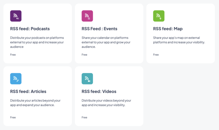 Très populaire dans les années 2000, le Flux RSS est toujours aussi pratique pour rendre son contenu interopérable avec d’autres plateformes. Vous pouvez désormais facilement diffuser votre contenu au-delà de votre application via des flux RSS. Nous vous avons ajouté plusieurs extensions RSS selon le type de contenu que vous produisez : Articles , Vidéos , Évènements , Carte et Podcasts