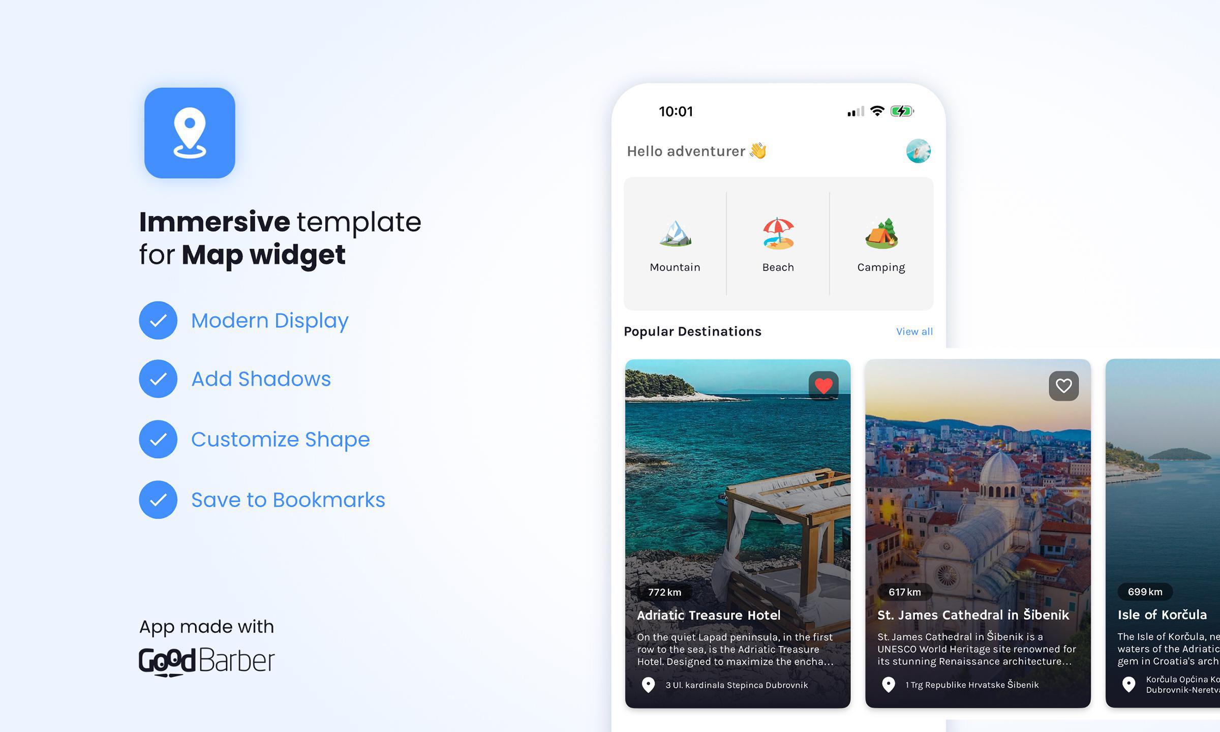 Chez GoodBarber, nous sommes toujours à la recherche de moyens innovants pour améliorer l'expérience utilisateur et permettre à vos contenus de briller sous leur meilleur jour. Aujourd'hui, nous sommes ravis de vous présenter une nouveauté : le template Immersive Card Banner pour le widget Carte.