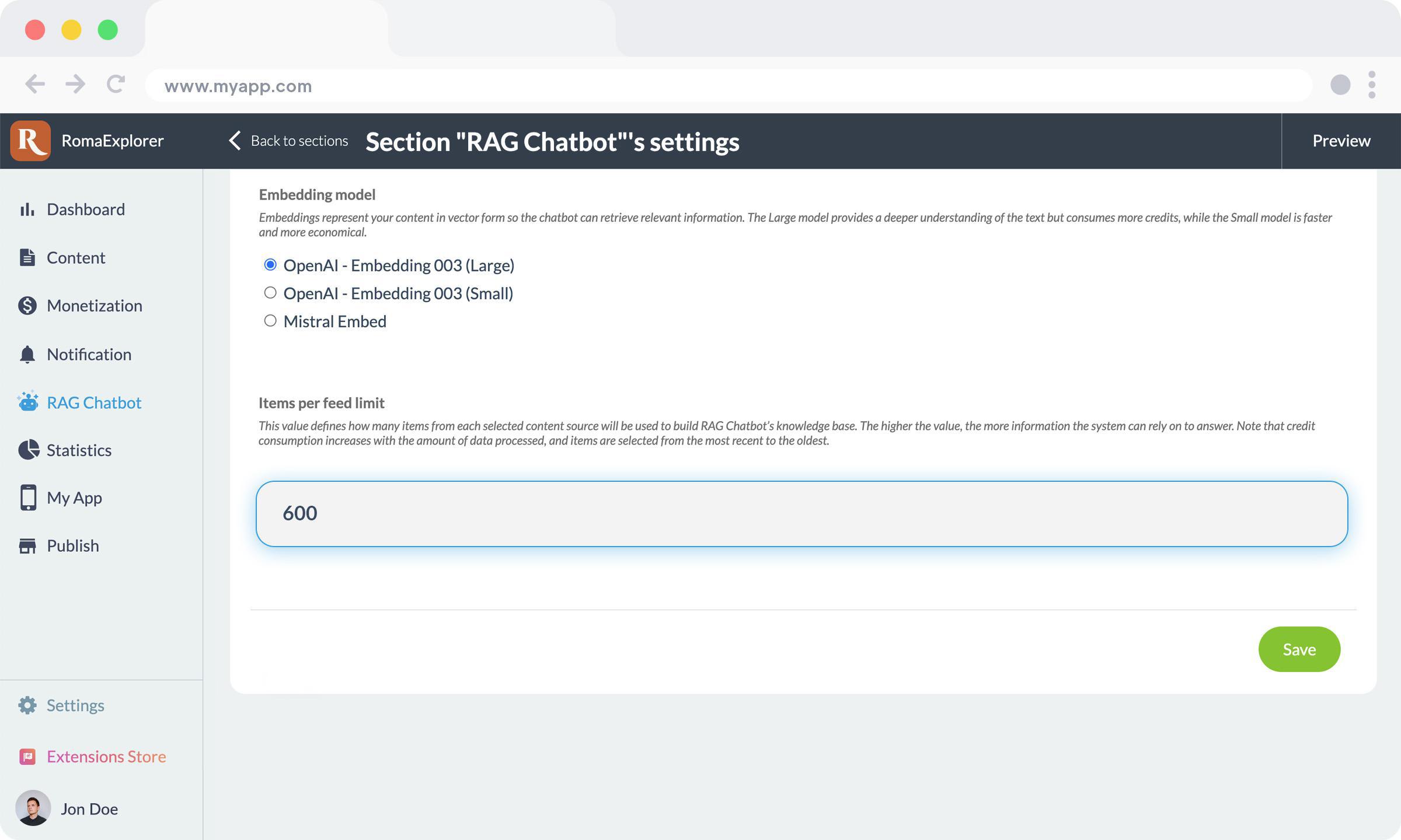 Le paramètre " Items Per Feed" définit le nombre d'éléments de contenu que le chatbot indexe à partir de chaque section ou sous-section que vous avez activée. Il contrôle directement l'étendue de la base de connaissances de votre chatbot.