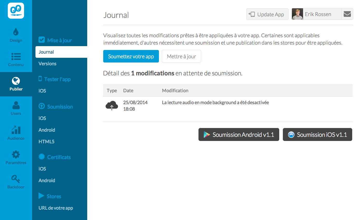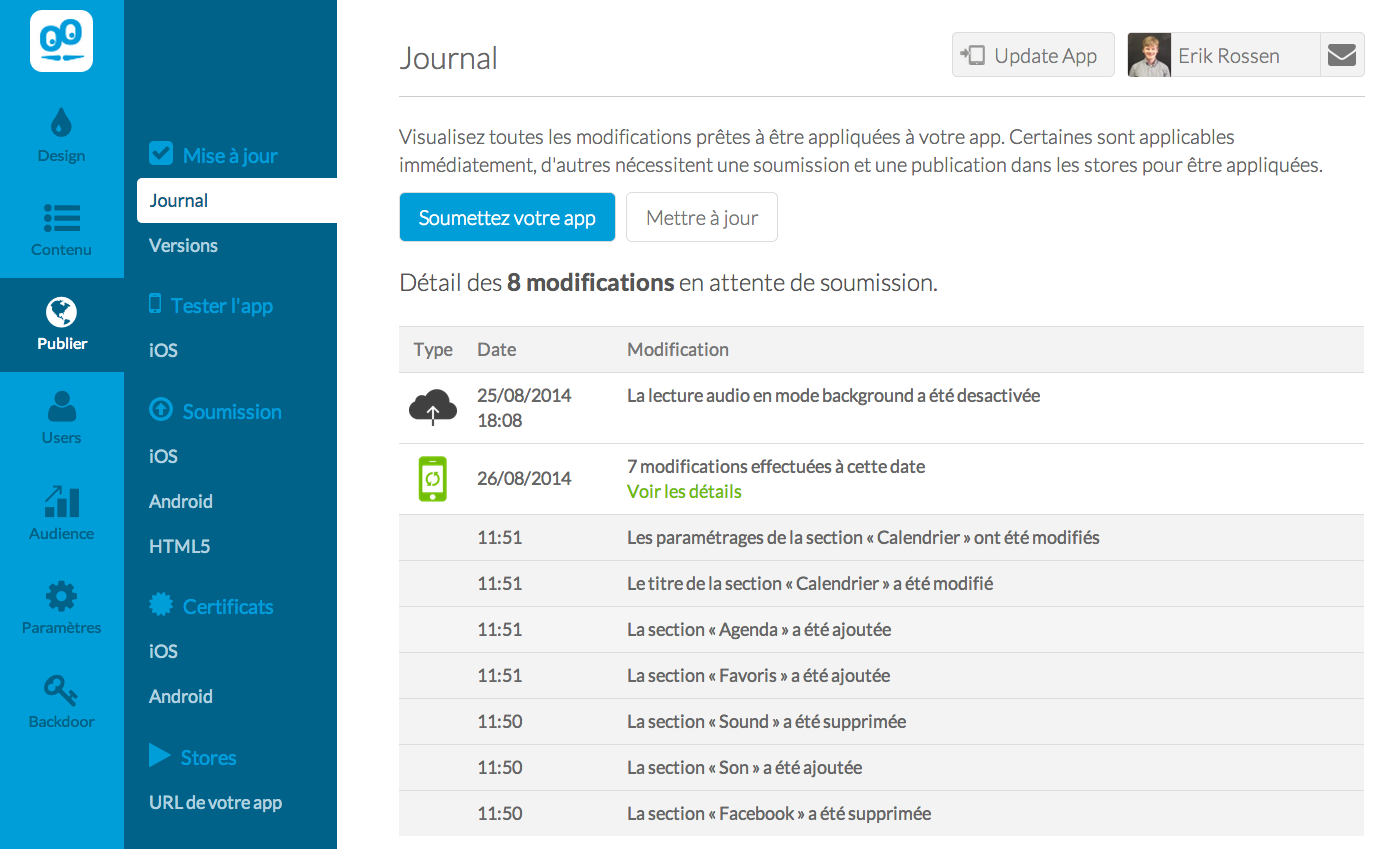 A chaque fois que vous modifiez votre application, les modifications ne sont pas appliquées immédiatement. Elles sont d'abord enregistrées dans un journal, et vous pouvez ensuite les appliquer quand vous le souhaitez. Quelques clics dans votre backoffice suffisent pour y arriver. Rendez-vous simplement vers Publication > Mise à jour > Journal. Vous y verrez toutes les modifications que vous avez faîtes depuis votre dernière mise à jour, triées par date. Si vous souhaitez voir les détails des changements d'un jour donné, cliquez simplement sur "Détails".