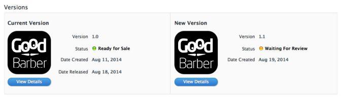 Vous verrez ensuite les deux versions de l'application côté-à-côté dans votre compte iTunes Connect: l'ancienne version (1.0, par exemple) avec un point vert et le statut "Ready for sale", et la nouvelle version (1.1, dans ce cas) avec le statut "Waiting for review". Chez Apple, vous avez également la possibilité de choisir si vous souhaitez que la nouvelle version soit publiée automatiquement après son approbation, ou bien si vous préférez être prévenu pour ensuite la publier vous-même. Comme pour une première soumission, le processus de révision peut durer entre 7 et 20 jours.