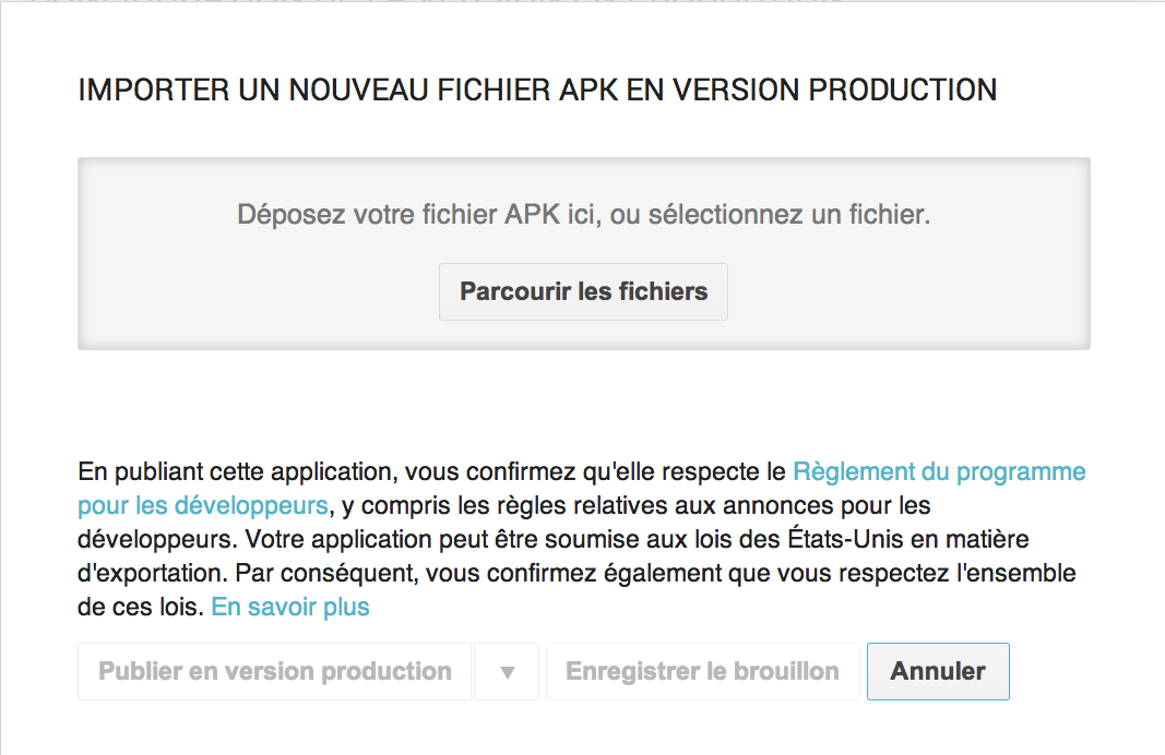 Comme chez Apple, le processus pour publier une mise à jour chez Google Play est semblable à celui d'une première soumission. Connectez-vous à votre compte Google Publisher pour afficher liste de toutes vos applications. Cliquez sur celle que vous souhaitez mettre à jour. Ensuite, sous l'onglet "Fichiers APK", cliquez sur "Importer un nouveau fichier APK en version production". Après avoir téléchargé le nouvel APK, vous pourrez spécifier les nouveautés de la nouvelle version. Finalement, pour terminer, cliquez sur le bouton "Publier" en haut à droite de la page. Après la révision, l'ancienne version sera automatiquement remplacée par la nouvelle.