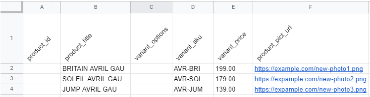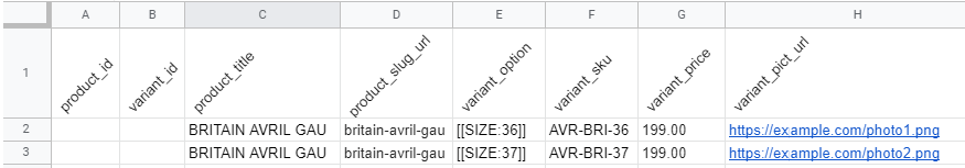 Comme pour notre cas précédent, remplissez les informations nécessaires dans votre produit. Puis, cette fois, utilisez la colonne variant_pict_url pour renseigner l'URL de l'image associée à chacune des variantes de votre produit.