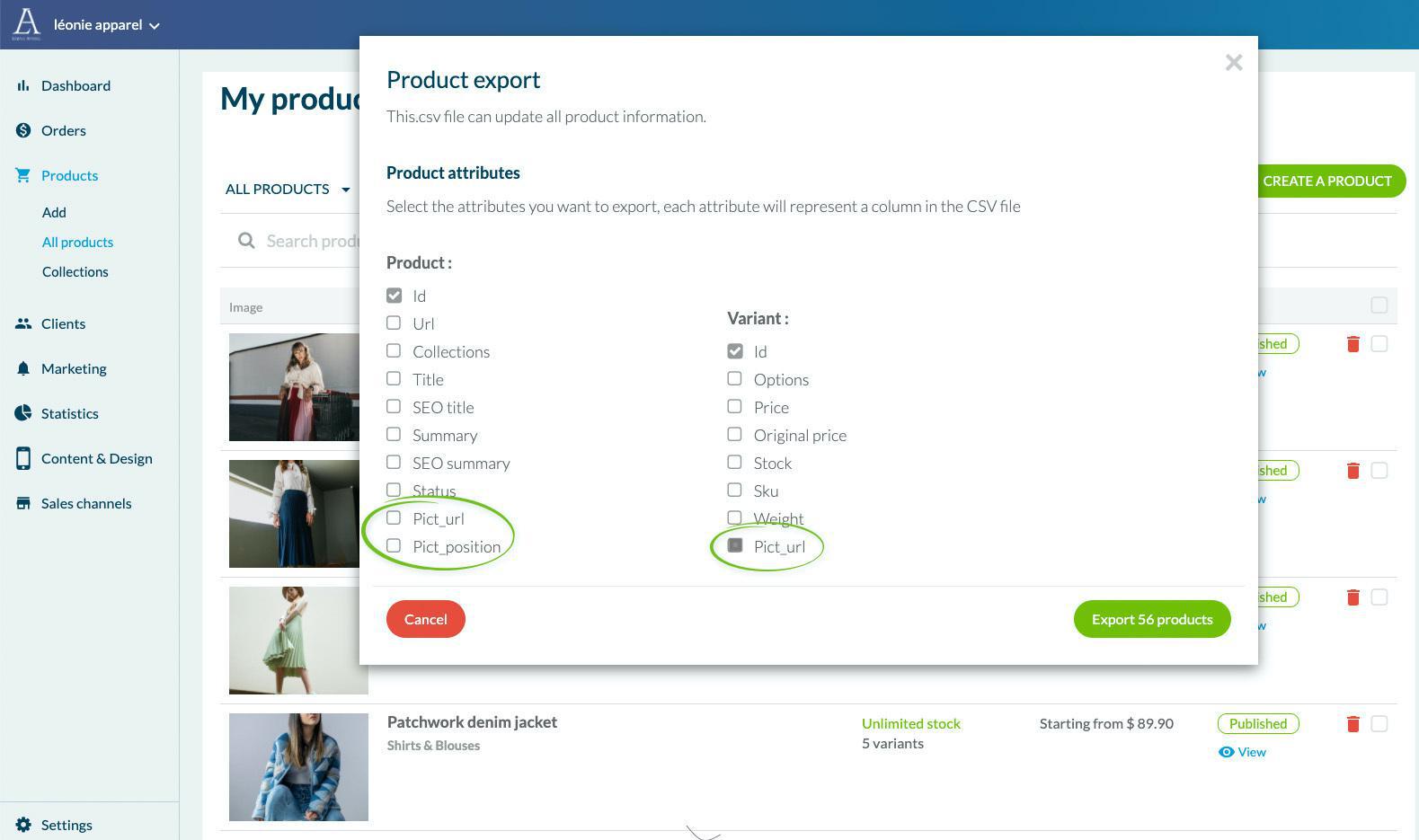 Remarque : si vous n'avez pas encore importé de produits dans le back-office de votre application, nous vous recommandons d'utiliser d'abord la fonction d'exportation. Cela vous donnera un exemple clair de la façon dont le fichier .csv est formaté. N'oubliez pas de sélectionner les champs dont vous avez besoin et les nouveaux champs d'image ;)