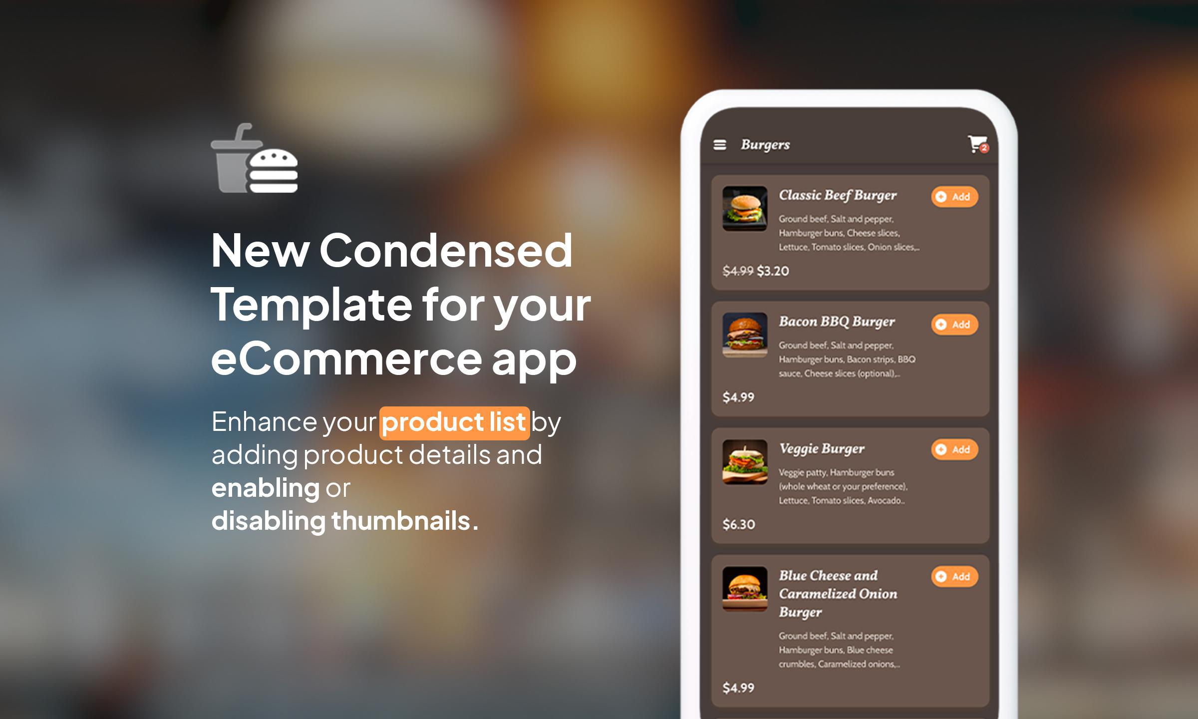 En quête d'une nouvelle approche pour sublimer la liste de vos produits dans la votre app eCommerce ? Nous sommes ravis de vous dévoiler notre dernier design : le template Condensed, conçue pour élever l'expérience d'achat à un tout autre niveau.