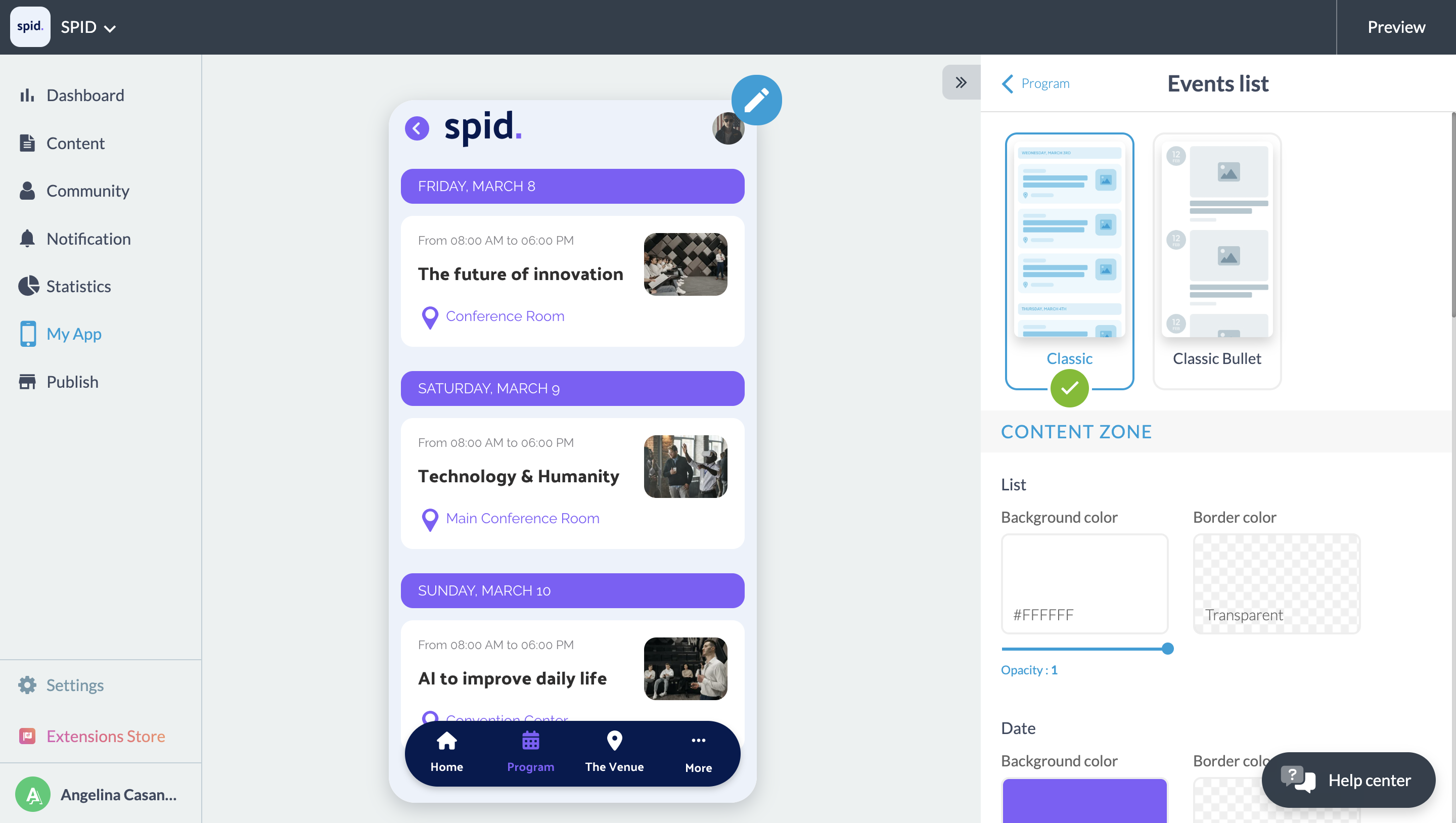 Dans votre back office, rendez-vous dans le menu My App > Structure. Choisissez ensuite la section Agenda à laquelle vous souhaitez appliquer le template Classic, ou créez-en une nouvelle. Ensuite, choisissez la vue de liste. Il ne vous reste plus qu'à sélectionner le template Classic et à le paramétrer.