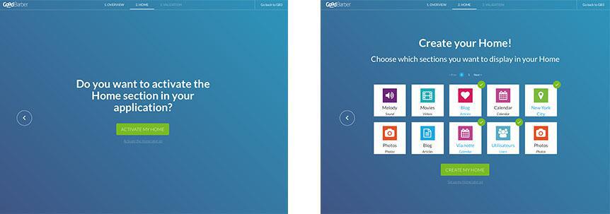 La deuxième étape de l'assistant concerne le paramétrage de la Home modulaire qui sera le premier écran de votre app, vous offrant la possibilité de choisir les contenus à mettre en avant et même d'articuler une navigation au sein de l'app. A cette étape du process de migration, vous pourrez choisir lors du développement si vous souhaitez ou non activer une section Home pour votre app. La décision n'est pas définitive, et il vous sera possible d'activer ou de désactiver cette section à tout moment, une fois la migration effectuée.