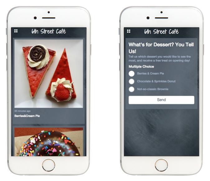 Plus il sera agréable pour vos utilisateurs de vous donner ces informations, plus ils seront enclins à le faire. Dans l'exemple ci-dessous, un café qui sera lancé prochainement fait la présentation de ses produits appétissants tout en demandant un feedback de la part des consommateurs concernant leurs préférences. C'est un moyen très simple de collecter des données et d'avoir une salle pleine de clients enthousiastes le jour de l'ouverture du café.