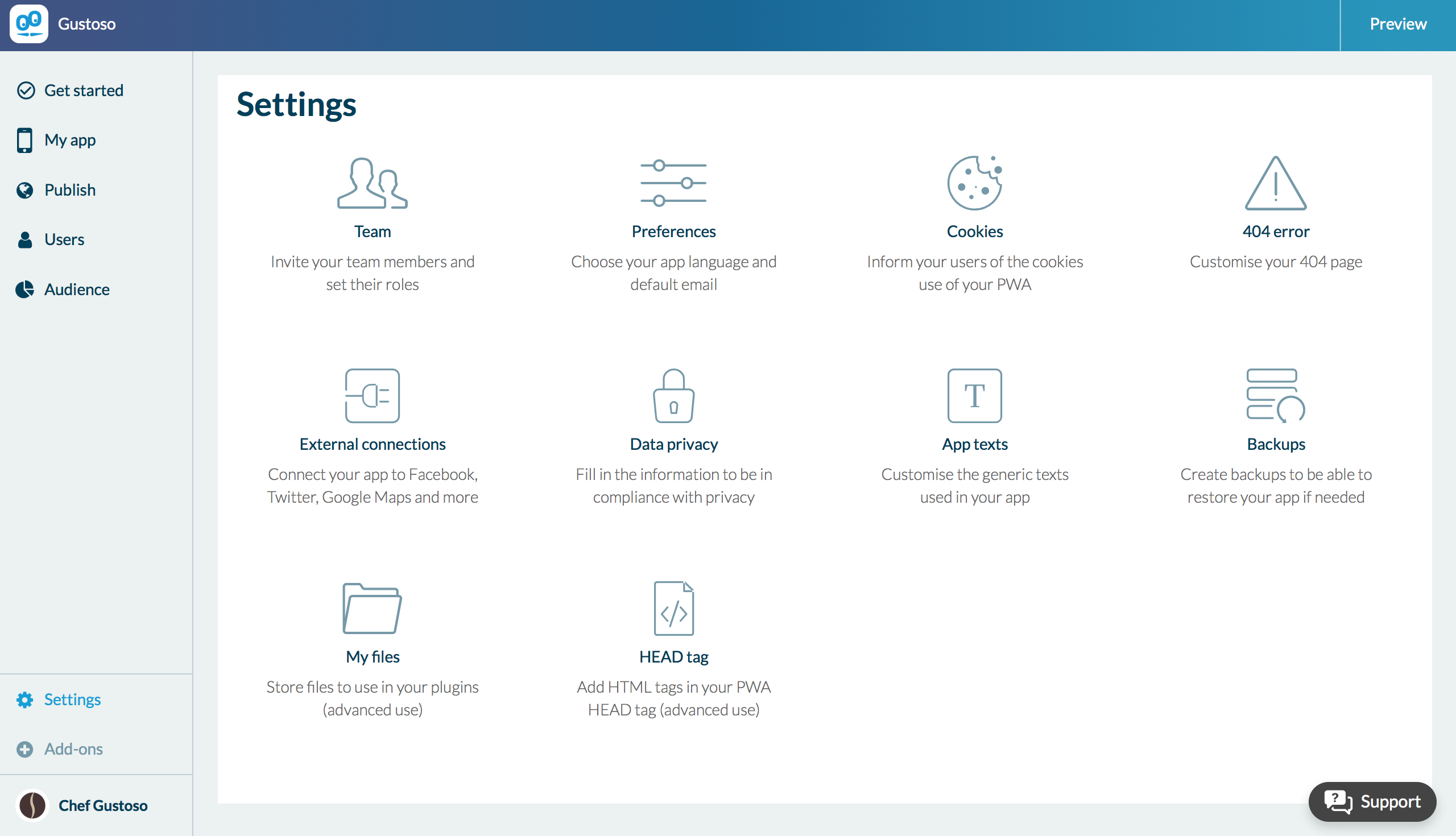 - Préférences, où vous pouvez choisir la langue de votre app et l'email de contact par défaut.