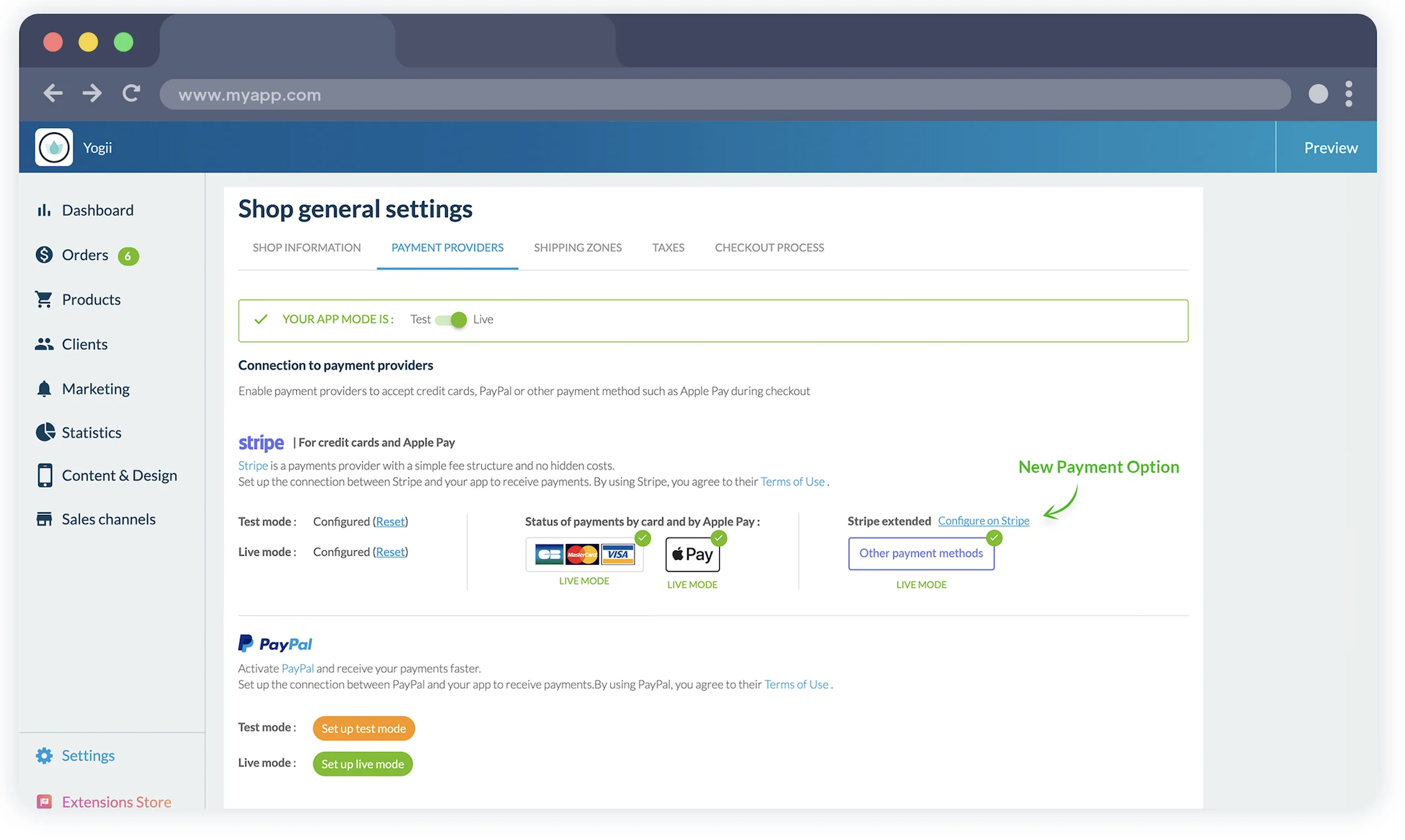 Dès que vos choix sont enregistrés, ils sont automatiquement disponibles dans le processus de checkout de votre app. Vos clients voient apparaître les nouvelles options et peuvent régler leur commande avec le moyen de paiement qui leur est le plus familier.